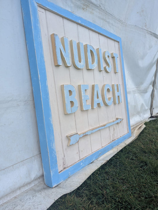 Add a unique touch to your outdoor space with this bespoke Nudest beach sign, styled...