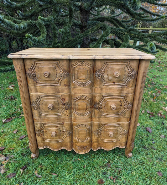This vintage French pine chest of drawers boasts exceptional hand carving and a beautiful serpentine...