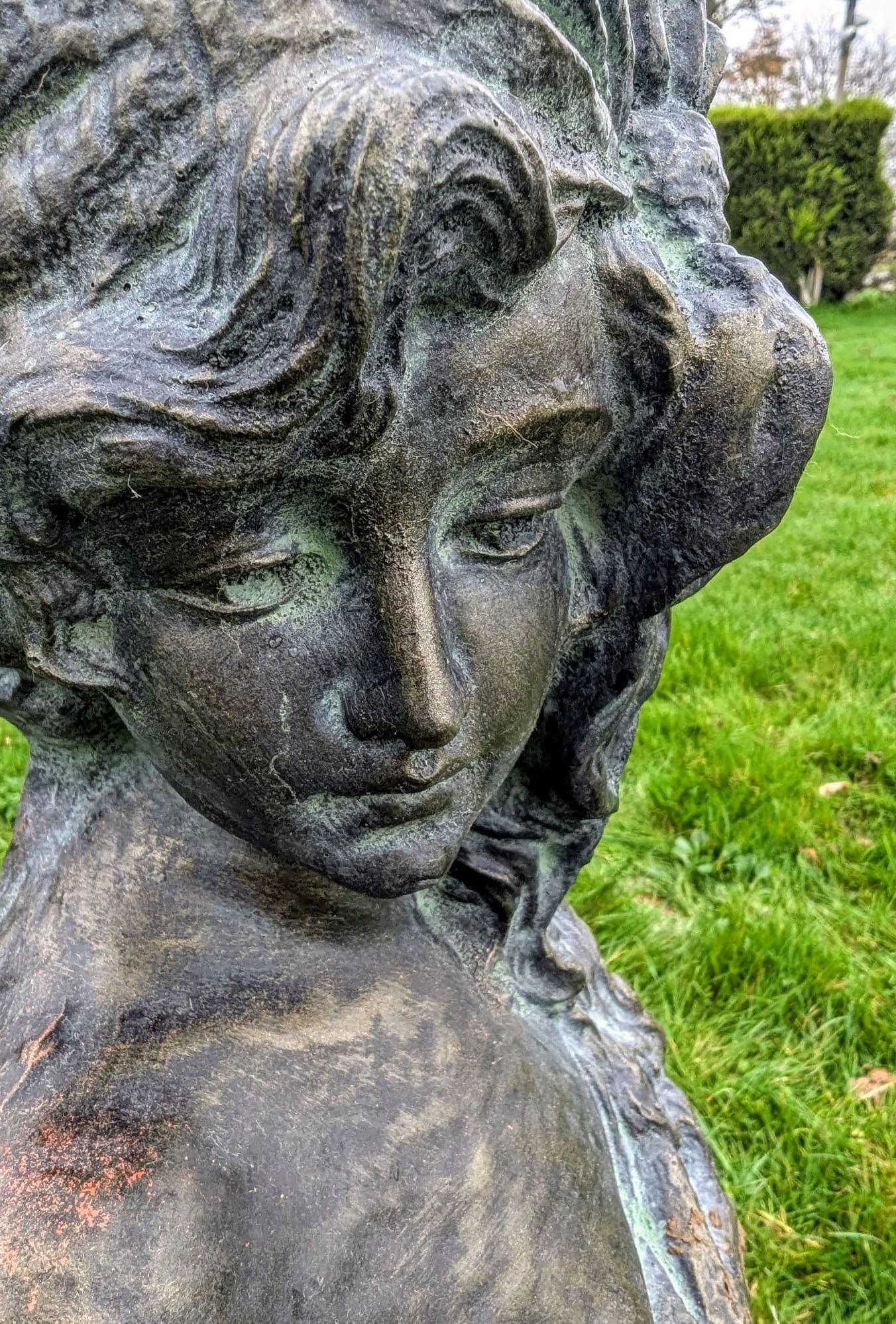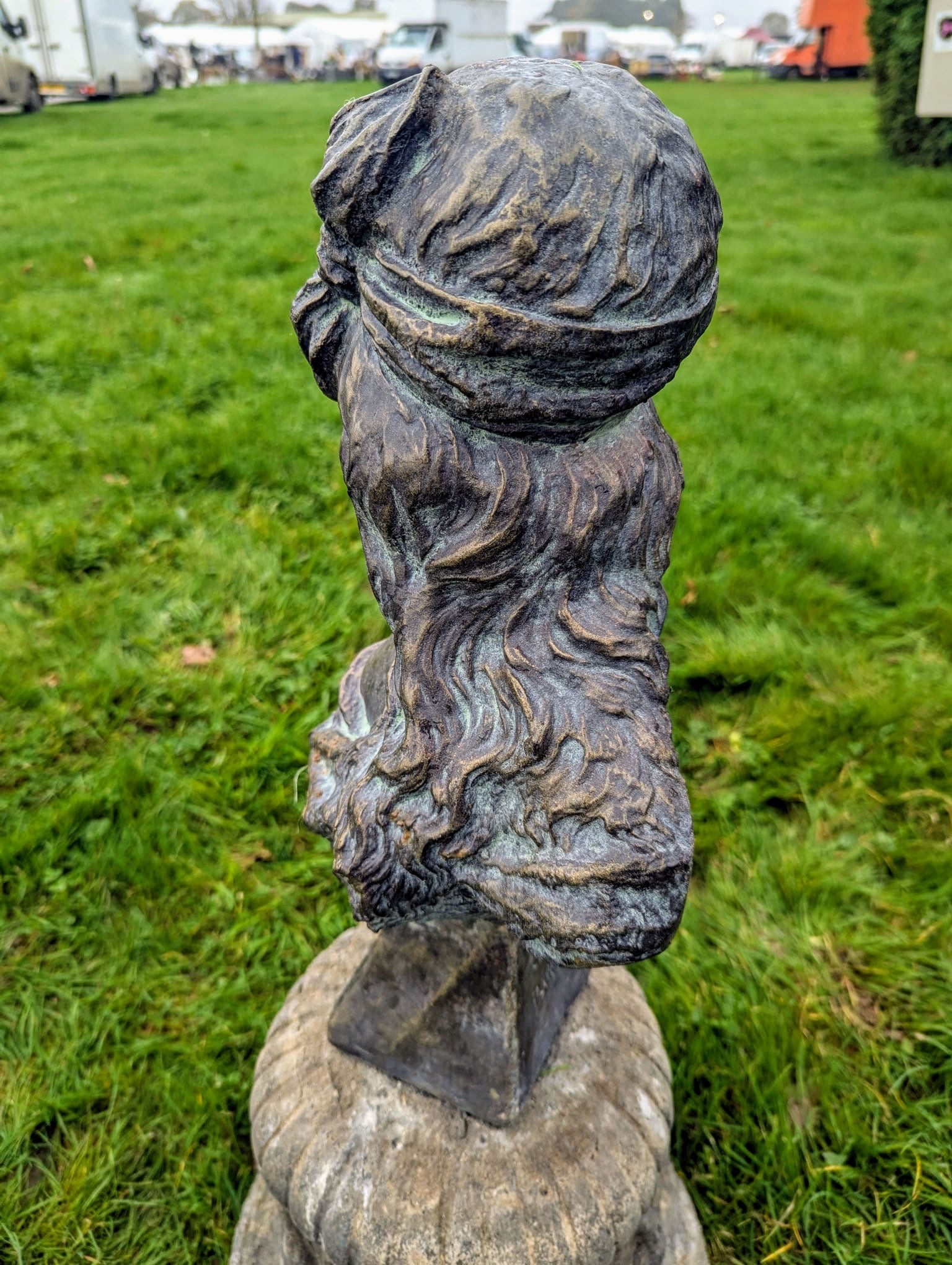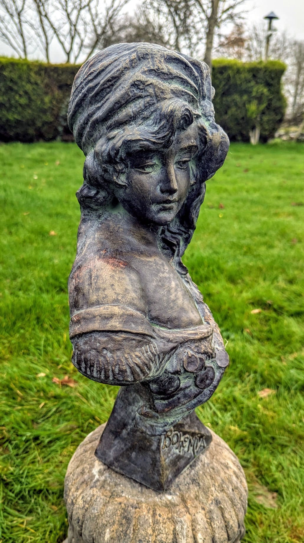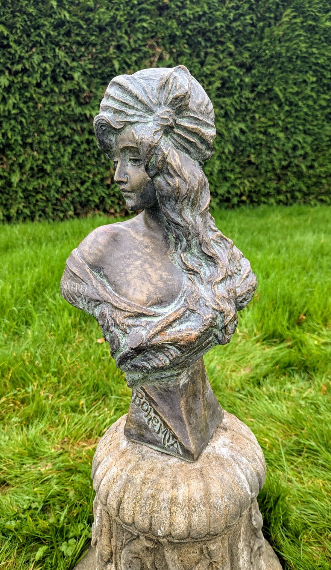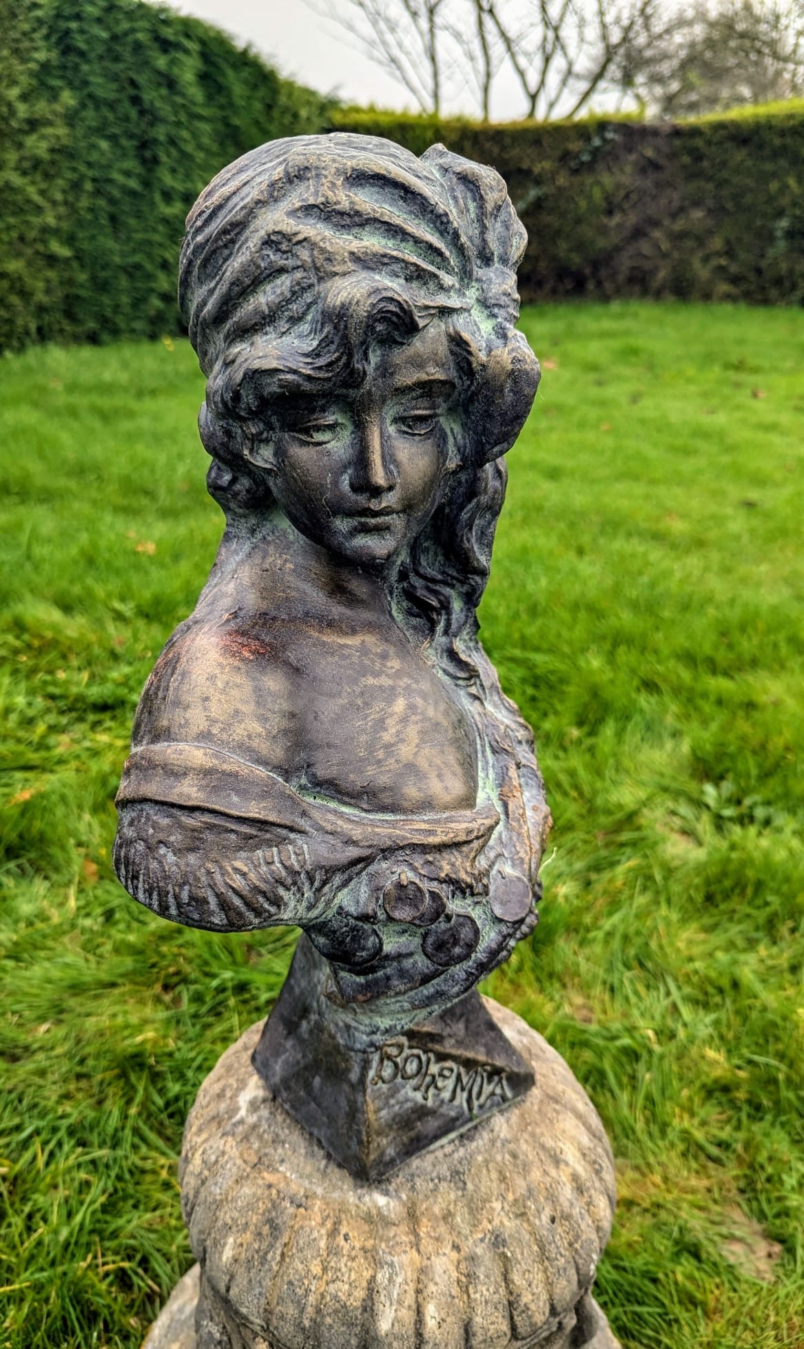This stunning unique lifesize bronze bust of Gypsy Bohemian is a true work of art that will add a touch of elegance to any room. With its intricate details patina and perfect verdigris finish, this piece is a wonderful example of Italian craftsmanship from the mid 20th century. It embodies all the qualities of a high-quality antique, from its originality to its exceptional beauty. Crafted from high-quality stone with a bronzed verdigris finish , this bust is a testament to the skill and artistry of its maker. Whether you're a collector of antiques or simply appreciate fine art, this beautiful piece is sure to impress. With delivery available, it's never been easier to add this exceptional bronze bust to your collection. 46 cm high 27 cm width 16 cm depth |