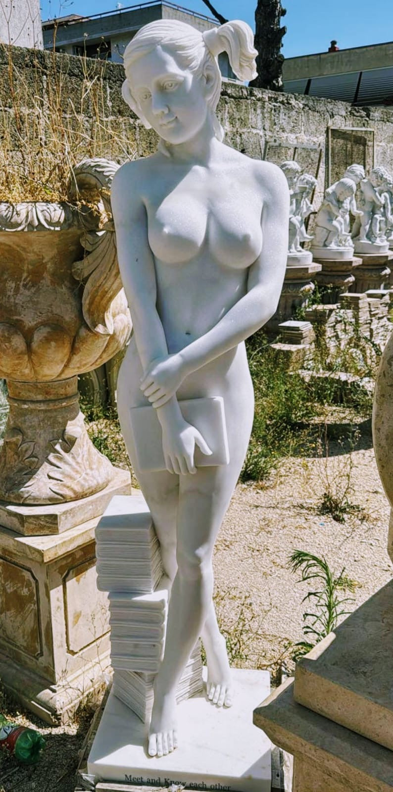 The beauty of this beautiful white marble statue is fascinating thanks to our exquisite carving processes. Our masters have unique aesthetic vision and experience. Statue is worked fine and well cared for in every detail, made of marble, very resistant and suitable for outdoor use.