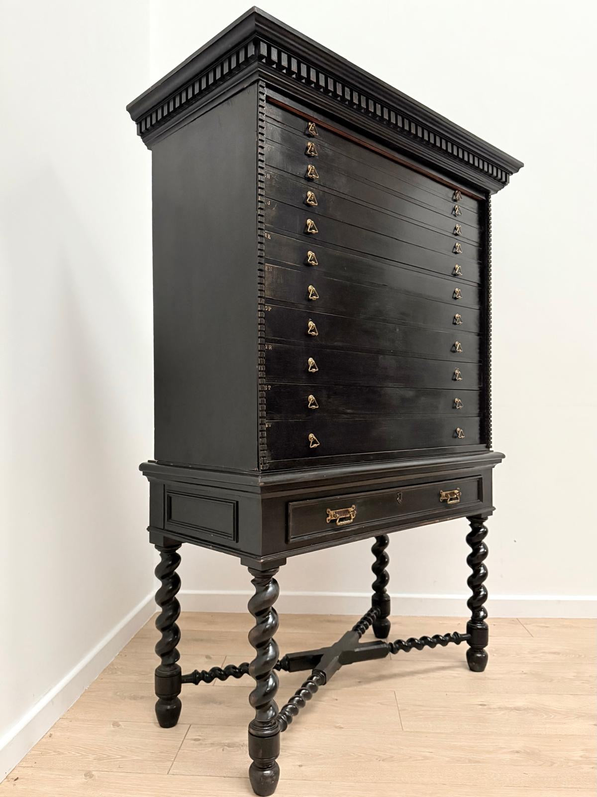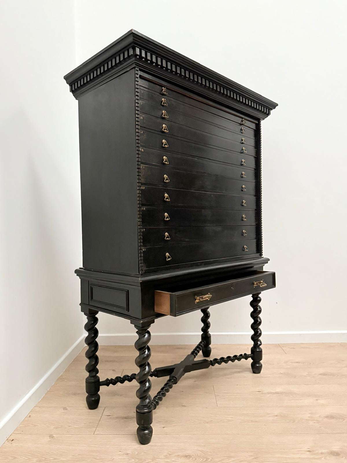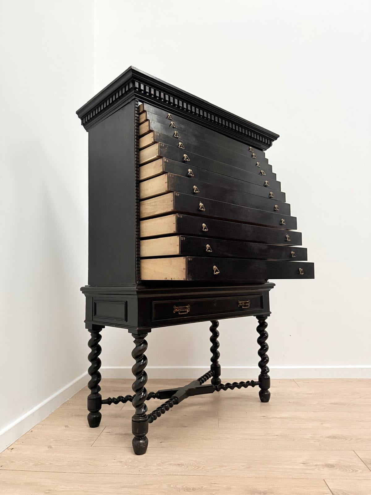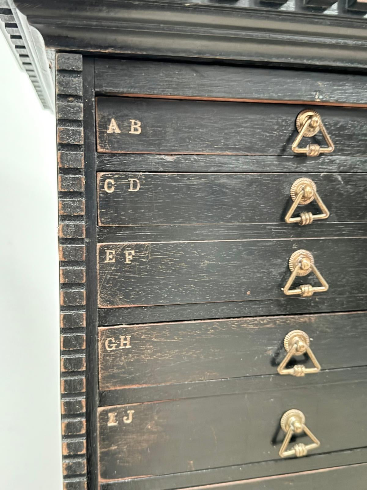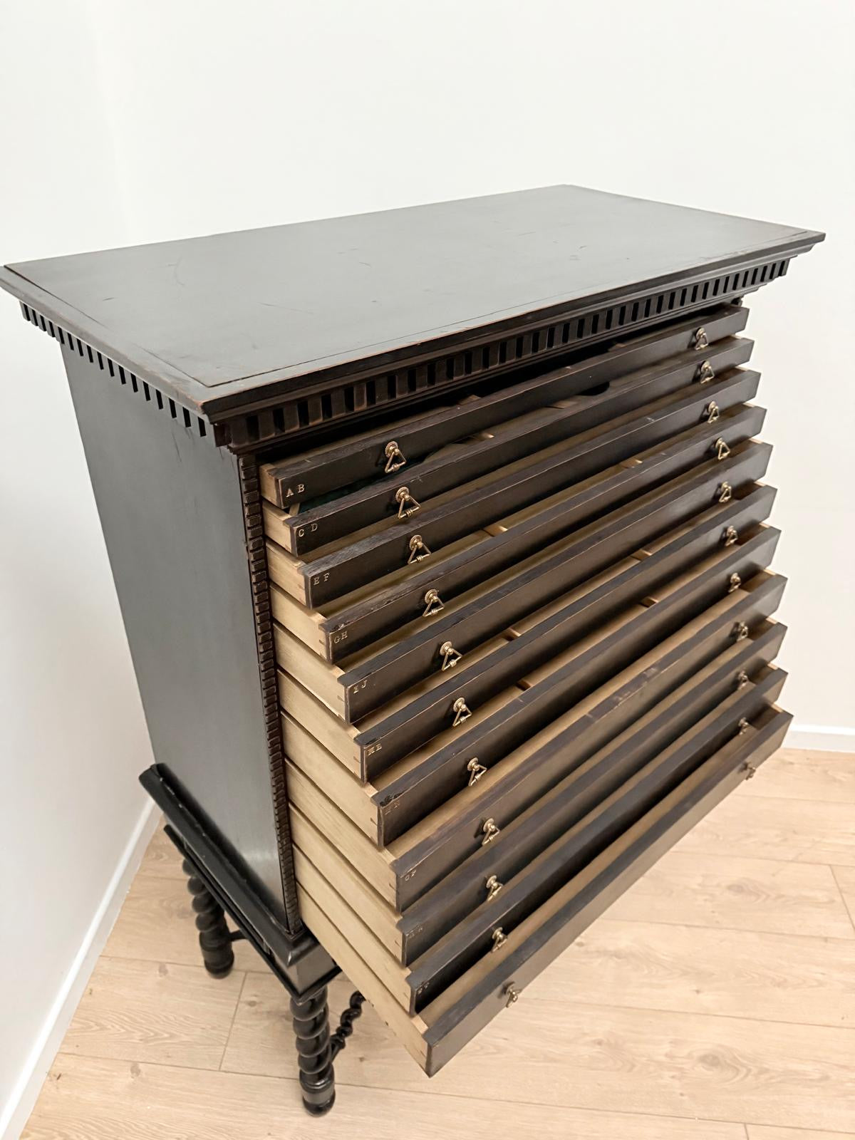 Crafted from brass and ebony, this Italian chest has more than 8 drawers, making it a practical and elegant storage solution for any antique collector. With its high gloss polished finish and intricate carvings and letter embossed drawers for organising, this original piece from cira 1890s exudes a sense of sophistication and nostalgia, perfect for adding a touch of vintage charm to any room. Made in France, this chest of drawers weighs 50 kg and stands at 138 cm in height. Delivery is available for this unique and timeless piece.