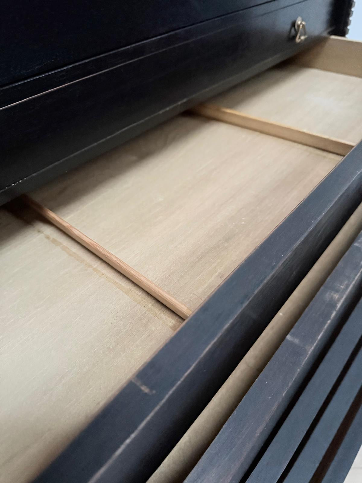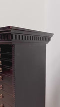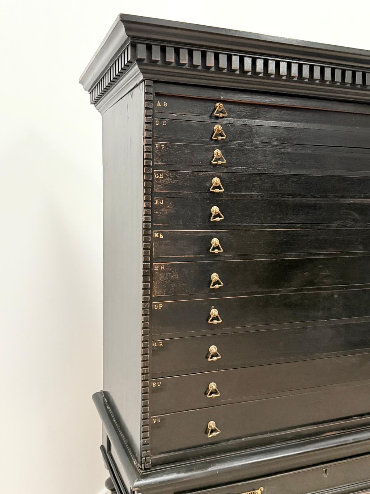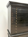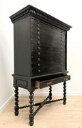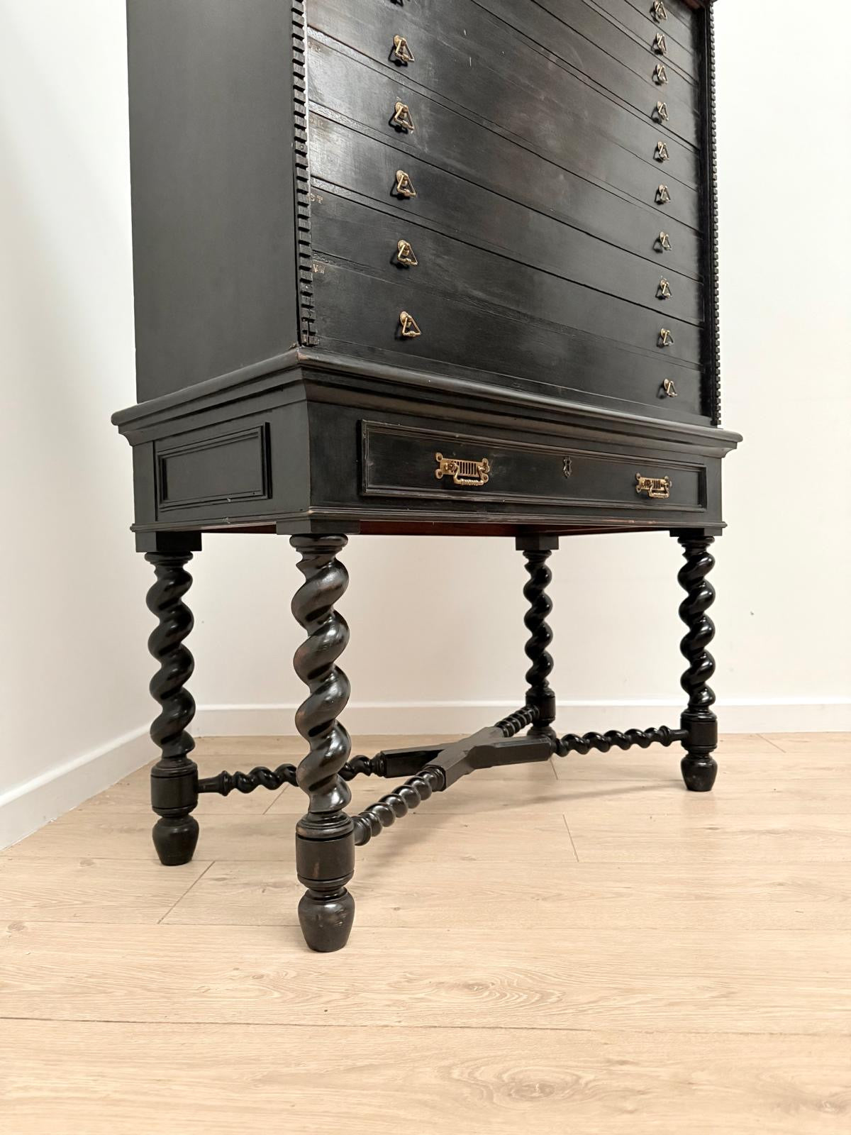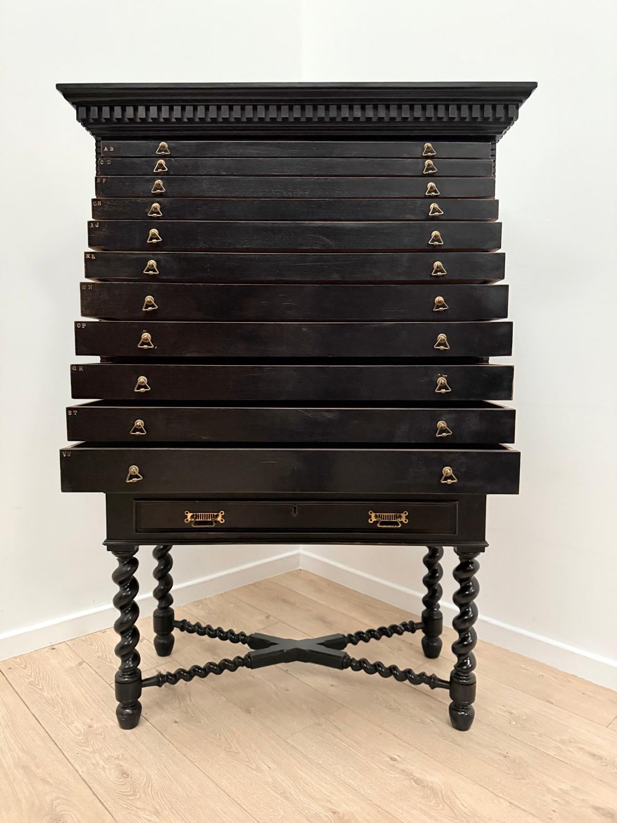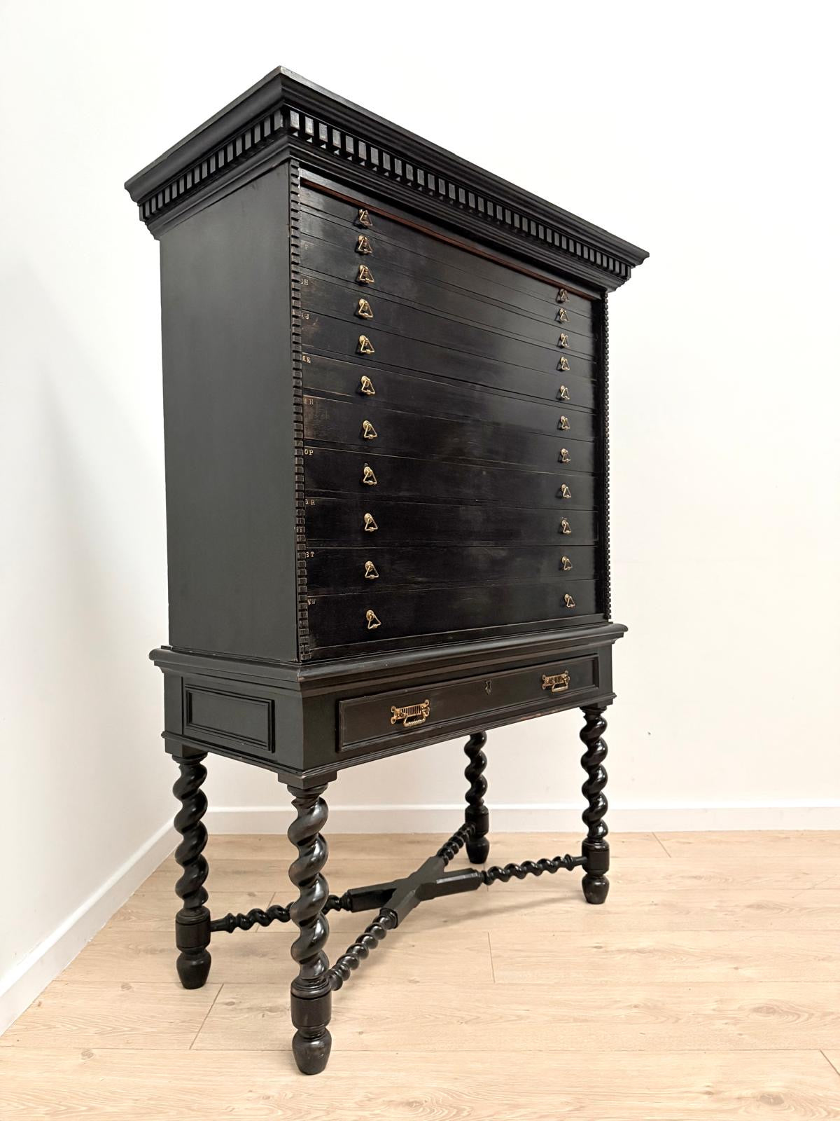 Crafted from brass and ebony, this Italian chest has more than 8 drawers, making it a practical and elegant storage solution for any antique collector. With its high gloss polished finish and intricate carvings and letter embossed drawers for organising, this original piece from cira 1890s exudes a sense of sophistication and nostalgia, perfect for adding a touch of vintage charm to any room. Made in France, this chest of drawers weighs 50 kg and stands at 138 cm in height. Delivery is available for this unique and timeless piece.