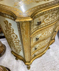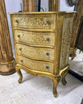 This antique Florentine chest of drawers is a stunning piece of antique furniture that will add a touch of elegance to any room. The chest features four drawers with intricate carvings and a polished finish. The natural wood pattern gives it a unique charm, and the gilded material adds to its overall beauty.