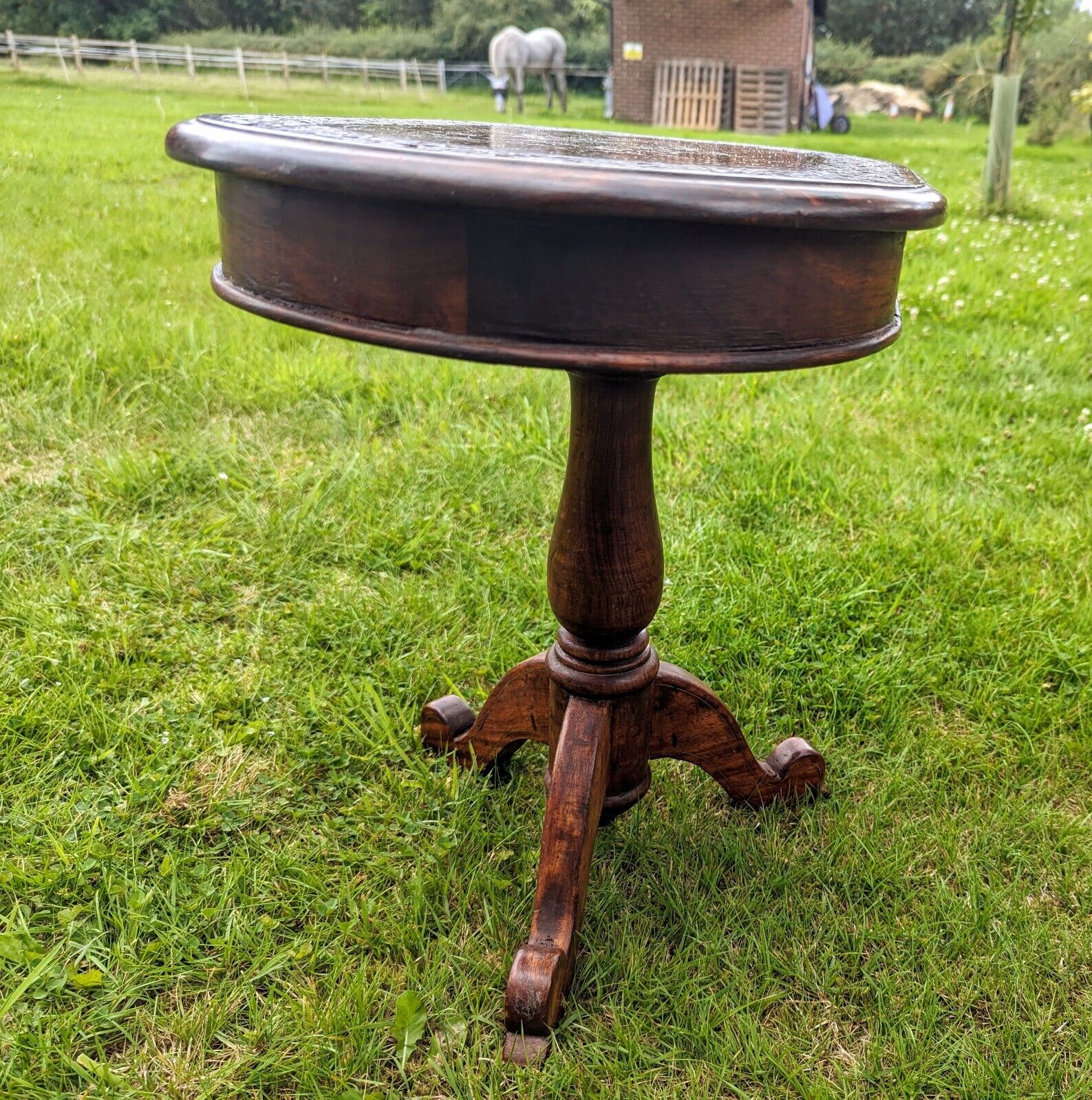 Behold this marvelous Indian-made occasional table! Its central tripod support and brass inlay add a splash of sophistication, while its intricate carvings capture the eye. An incredible find!