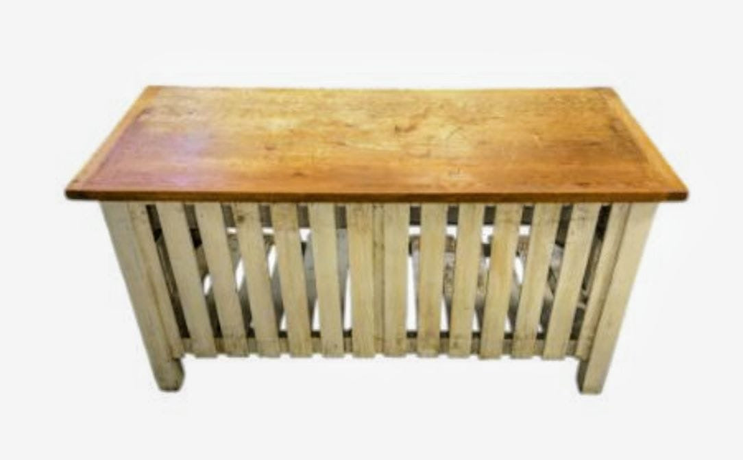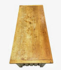 This vintage French country house bakers island table is a fully assembled piece with a rectangle shape and a tabletop made of pine.