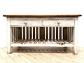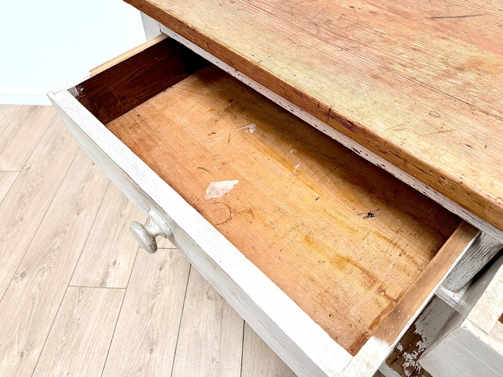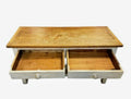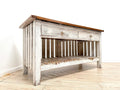 The shabby, natural coloured table top with 2 freize drawers and a waxed finish is perfect for both indoor and outdoor use, adding a touch of charm to any room.