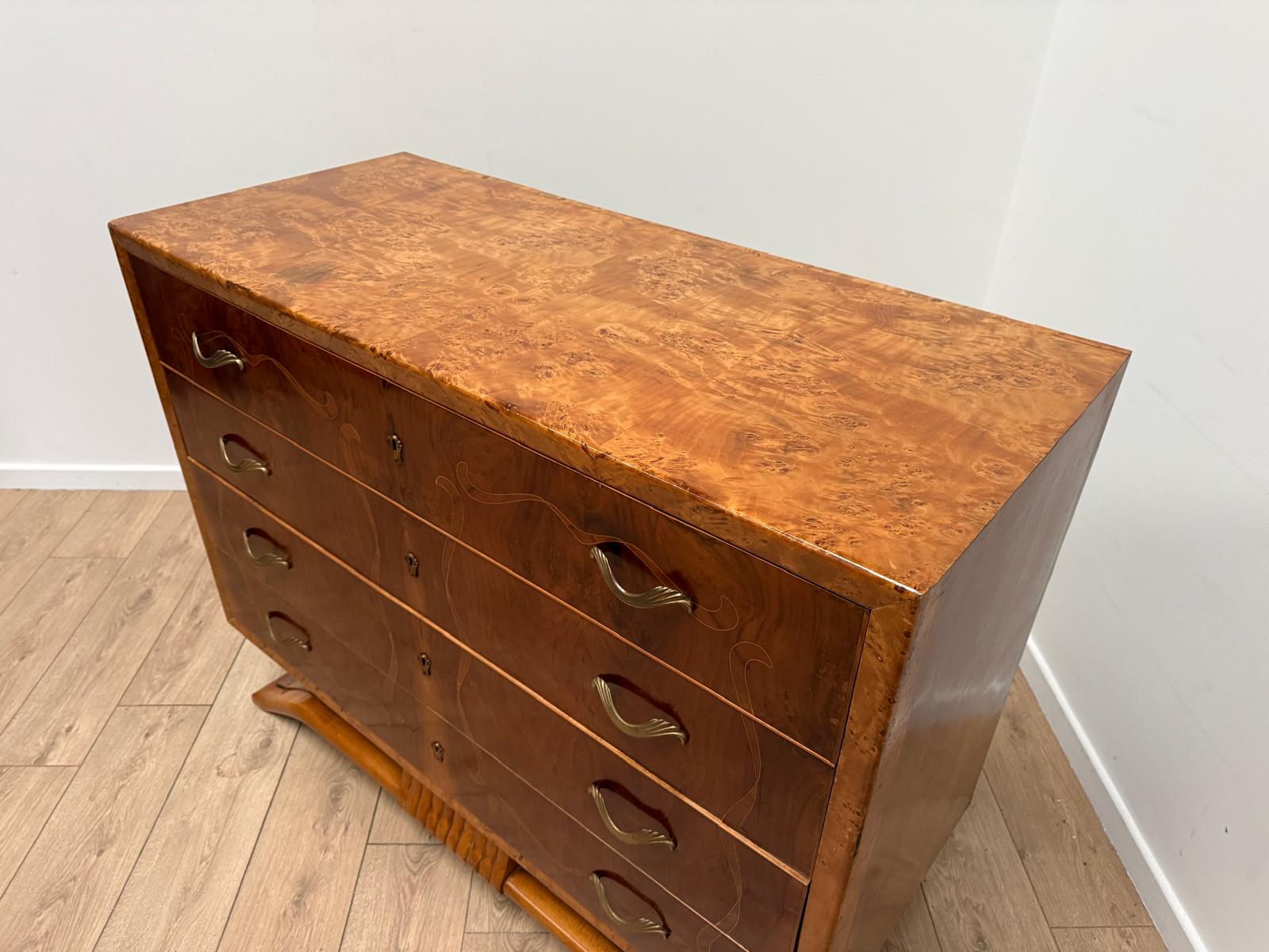 Experience the timeless beauty of this authentic Italian Art Deco dresser. Made in the 1920s, it boasts a stunning walnut exterior with intricate maple inlays that exude elegance and sophistication. With four spacious drawers, this dresser offers ample storage while adding a touch of glamour to any room.