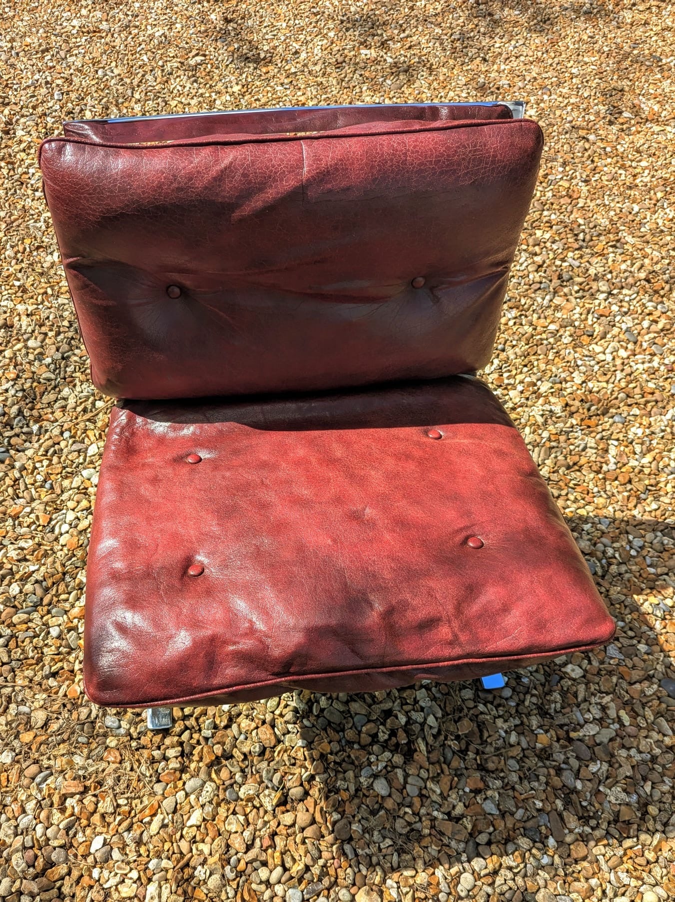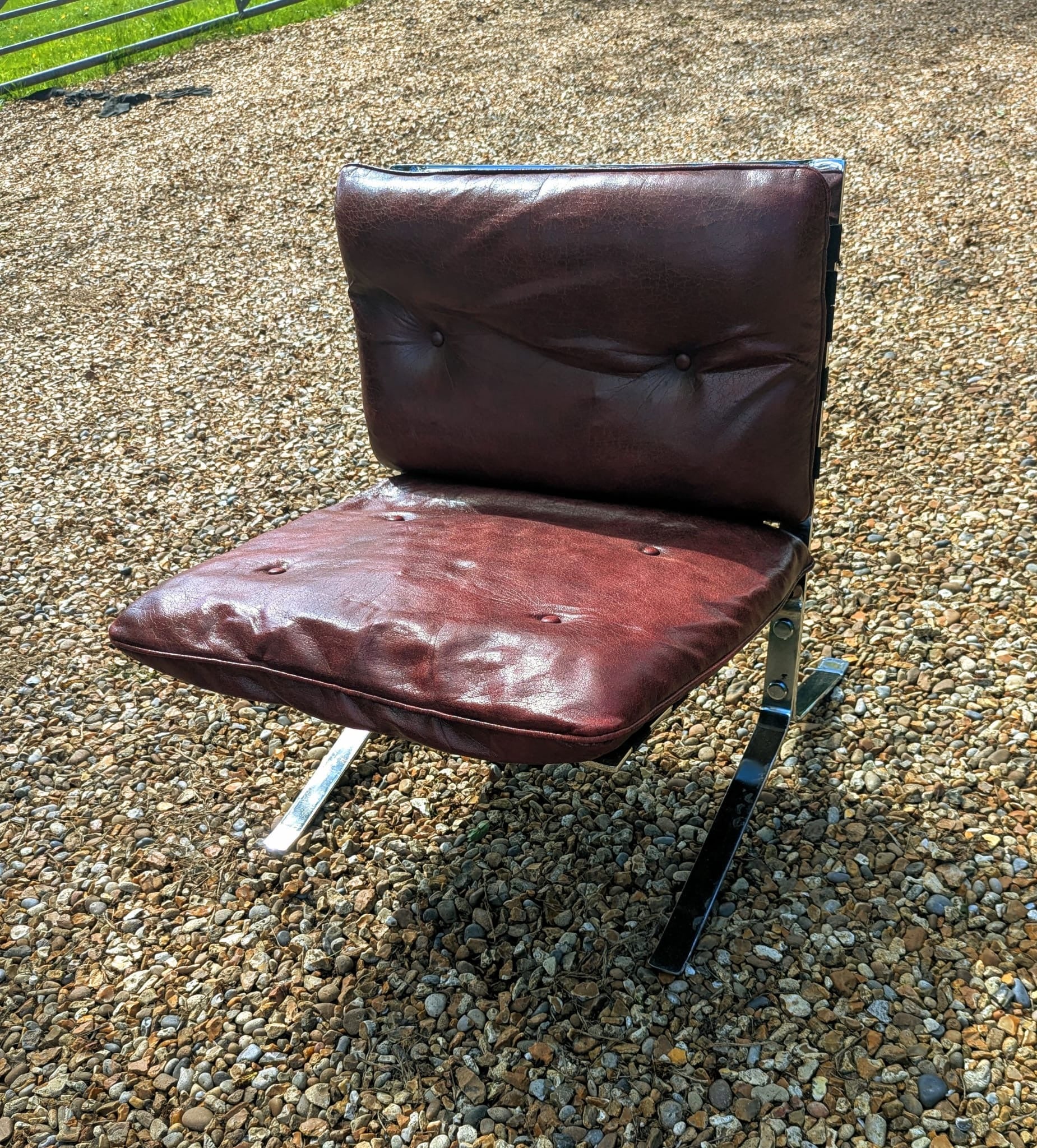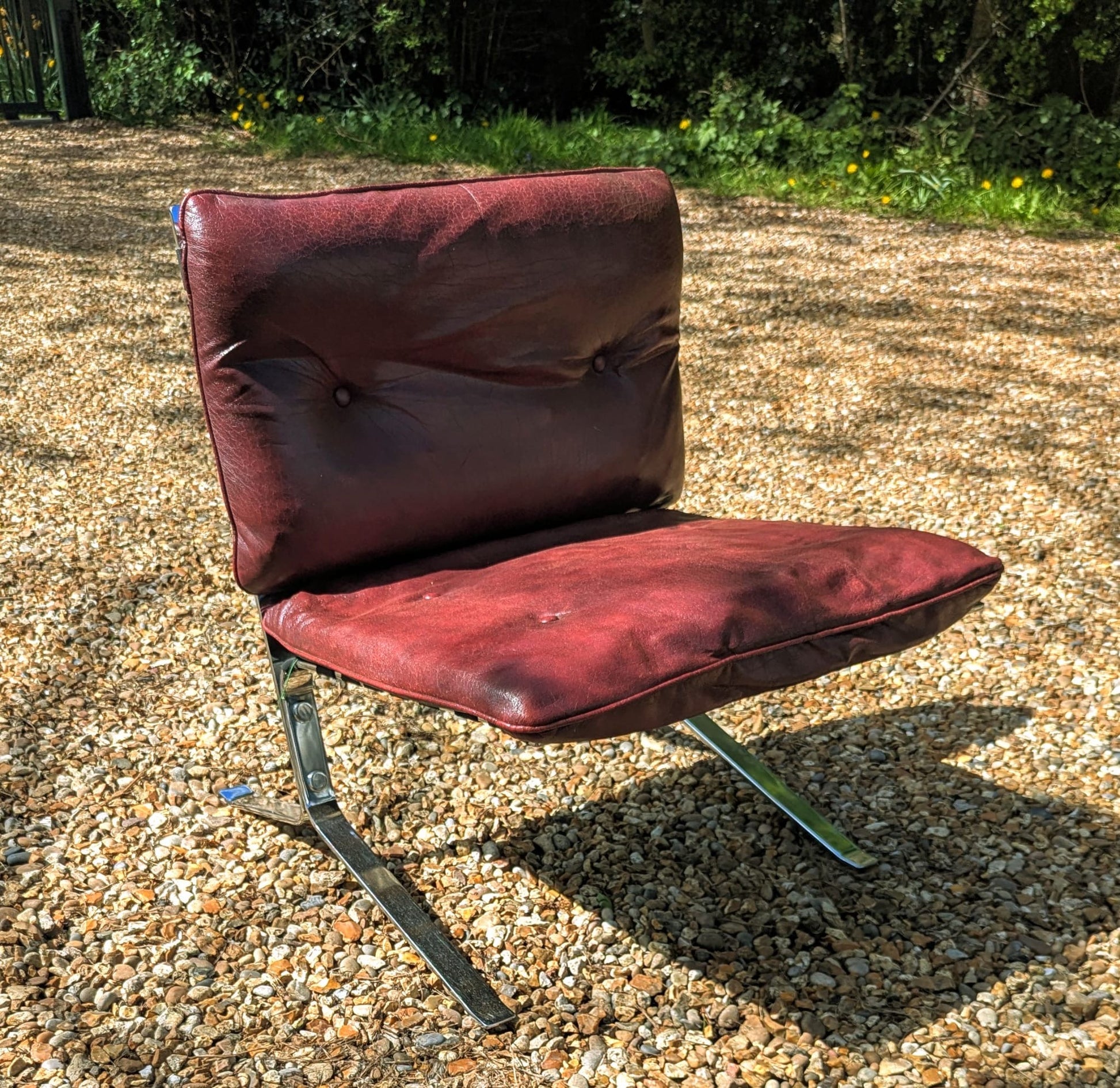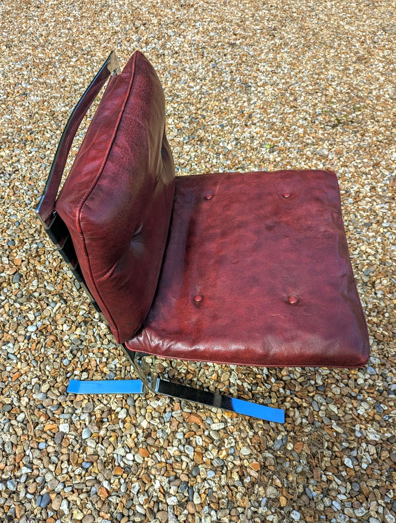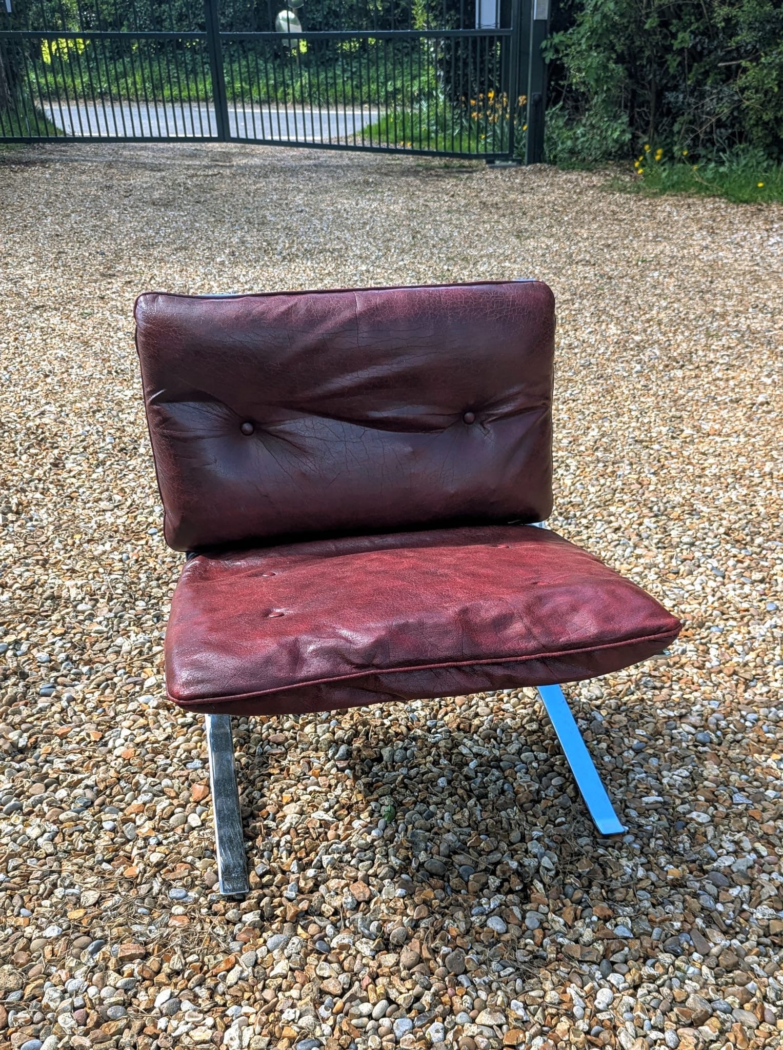 French 'Joker' lounge chairs, 1960s, designed for Airbourne, each chromed steel frame raised from 'T' shaped supports, with seat and back cushion upholstered in burgundy Leather.