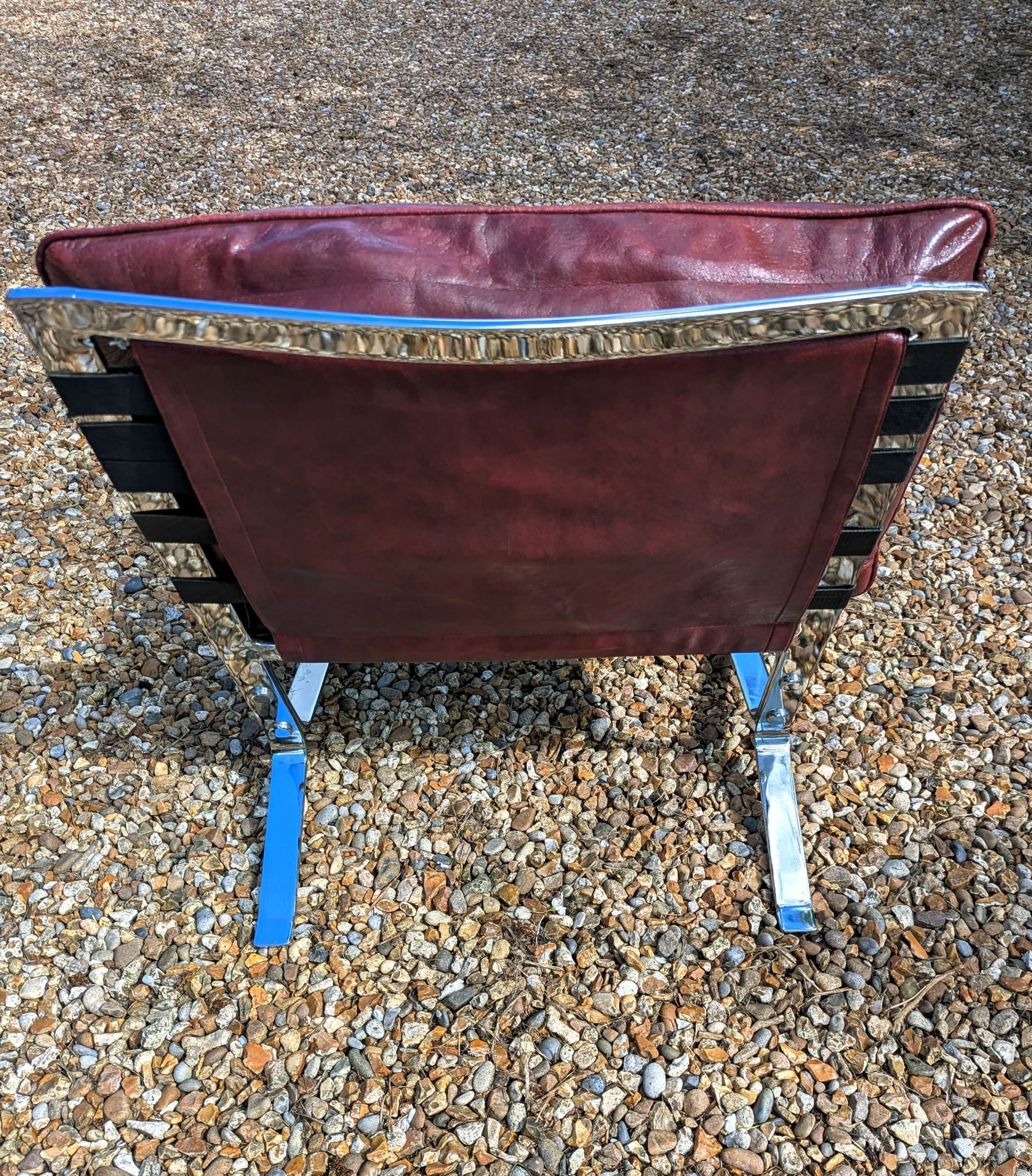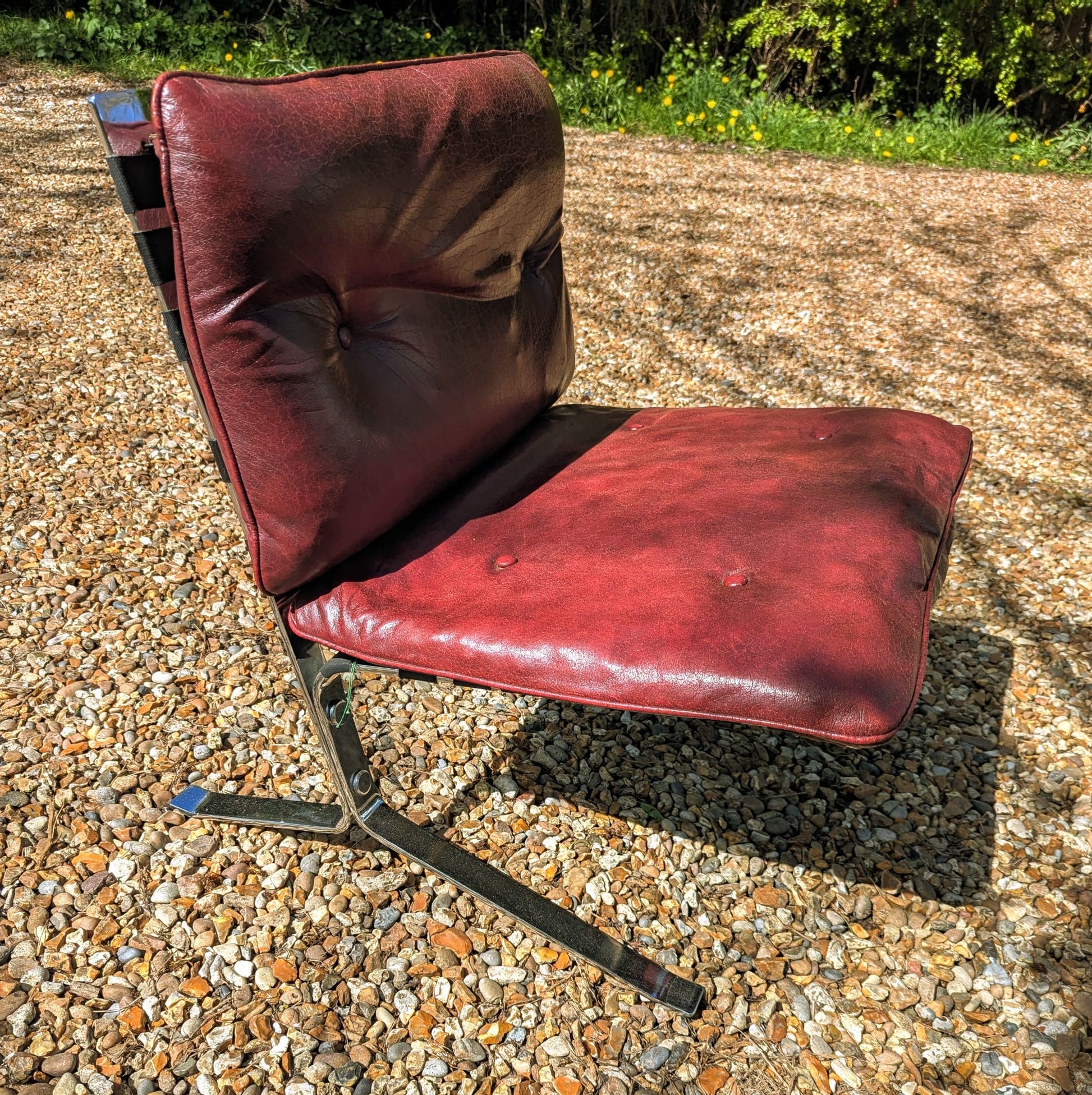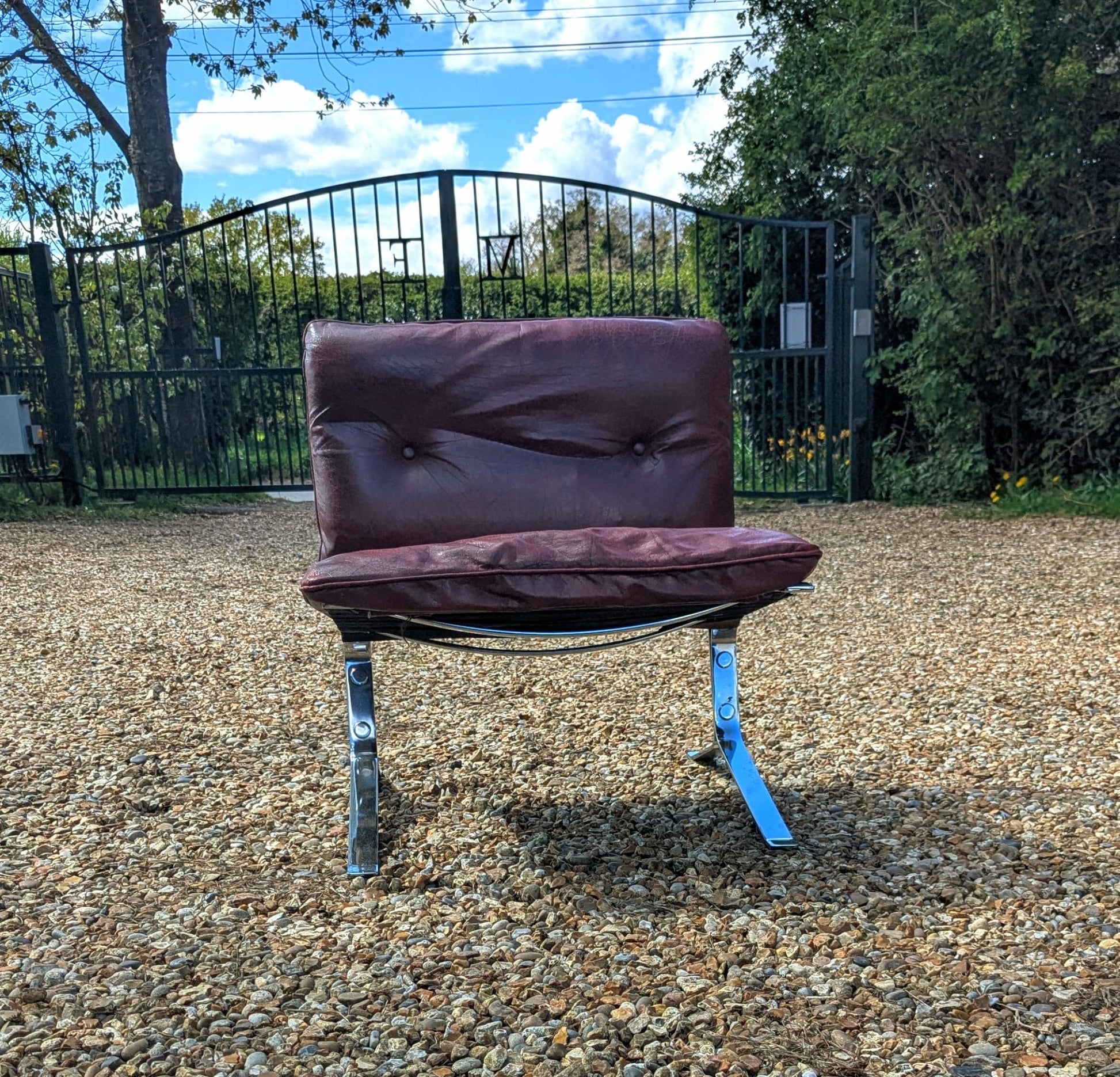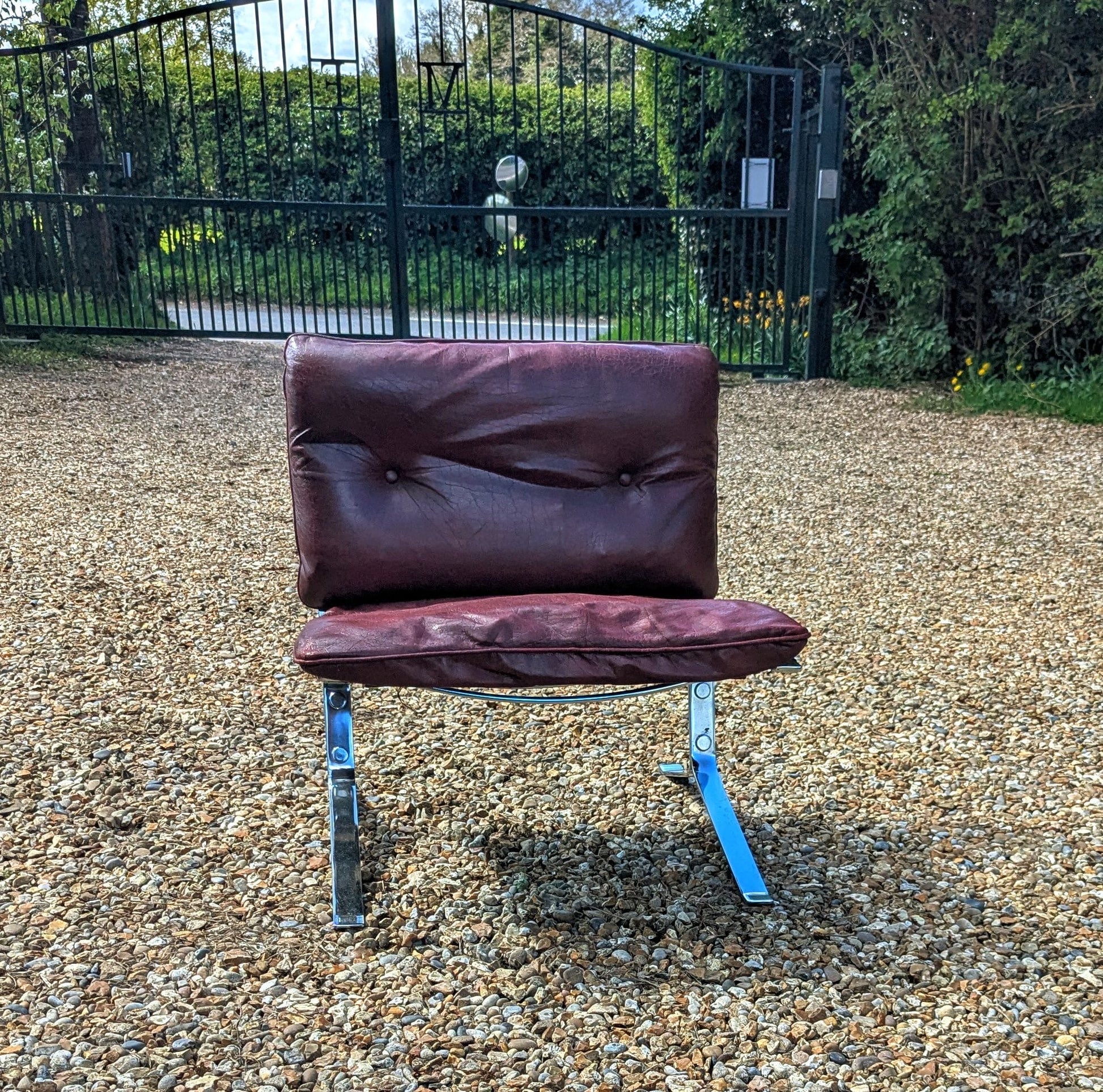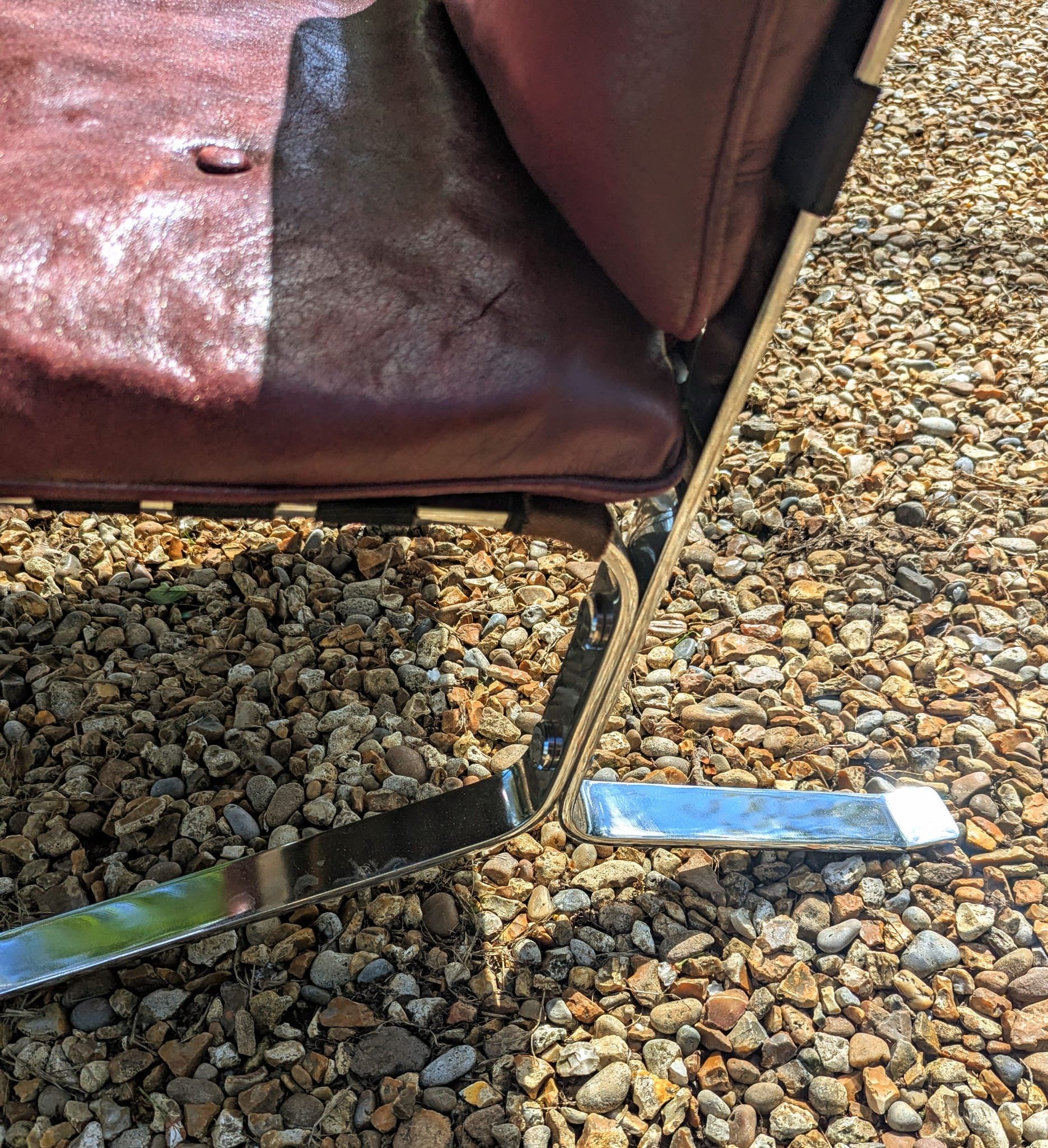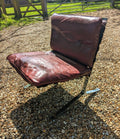 French 'Joker' lounge chairs, 1960s, designed for Airbourne, each chromed steel frame raised from 'T' shaped supports, with seat and back cushion upholstered in burgundy Leather.