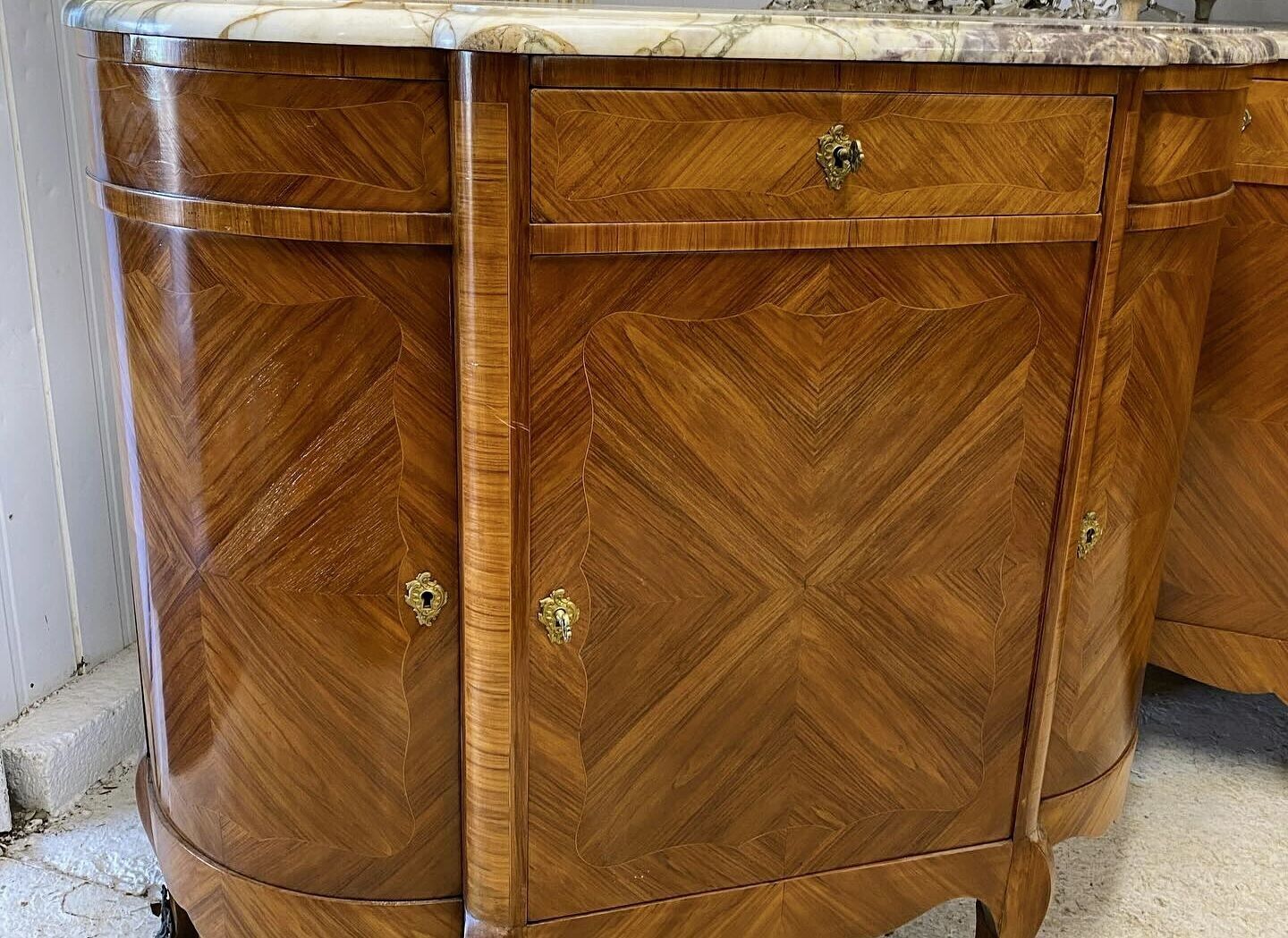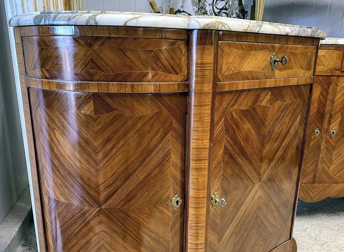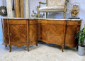 This beautiful buffet sideboard is a true masterpiece of Louis XV furniture design. Fantastic shaped marble top bow ended quarter veneered cabinet in king wood with drawers above cabinets with column fronts raised on elegant short cabriole feet.
