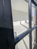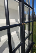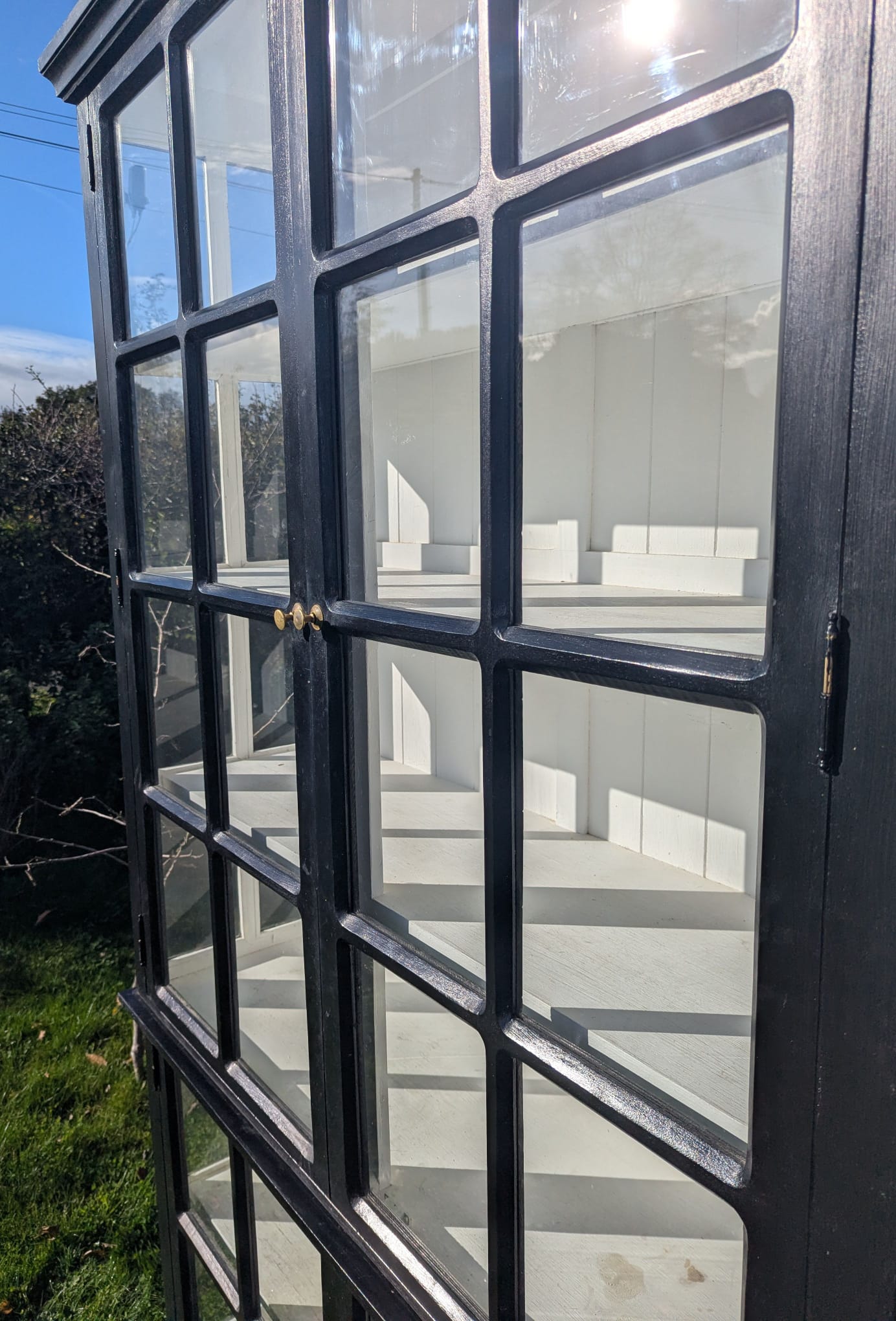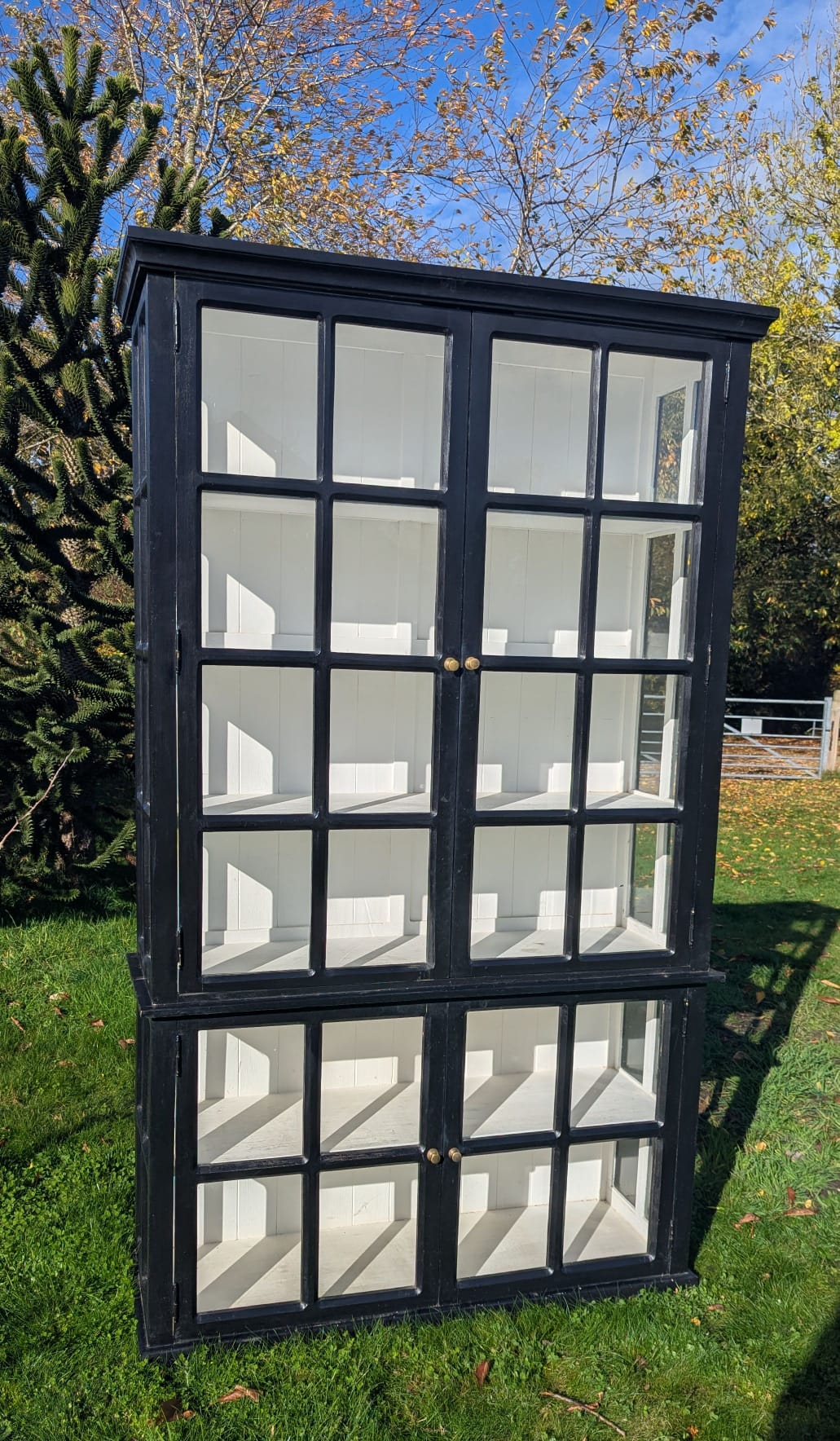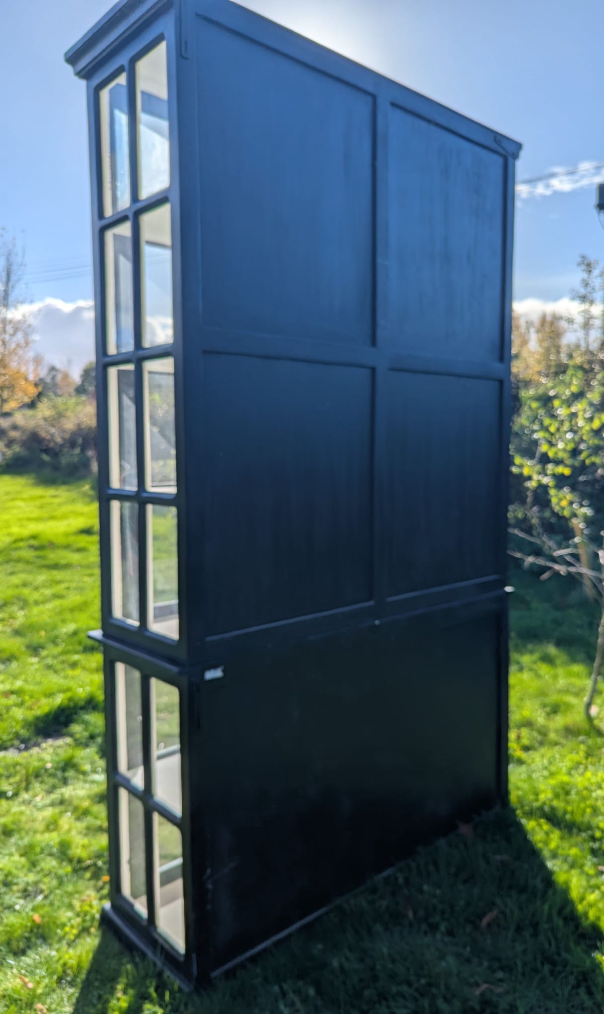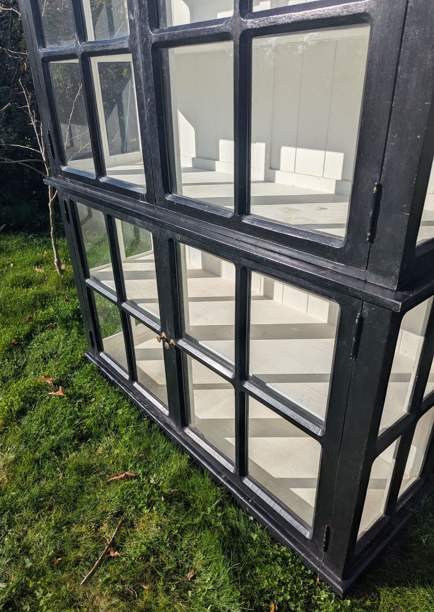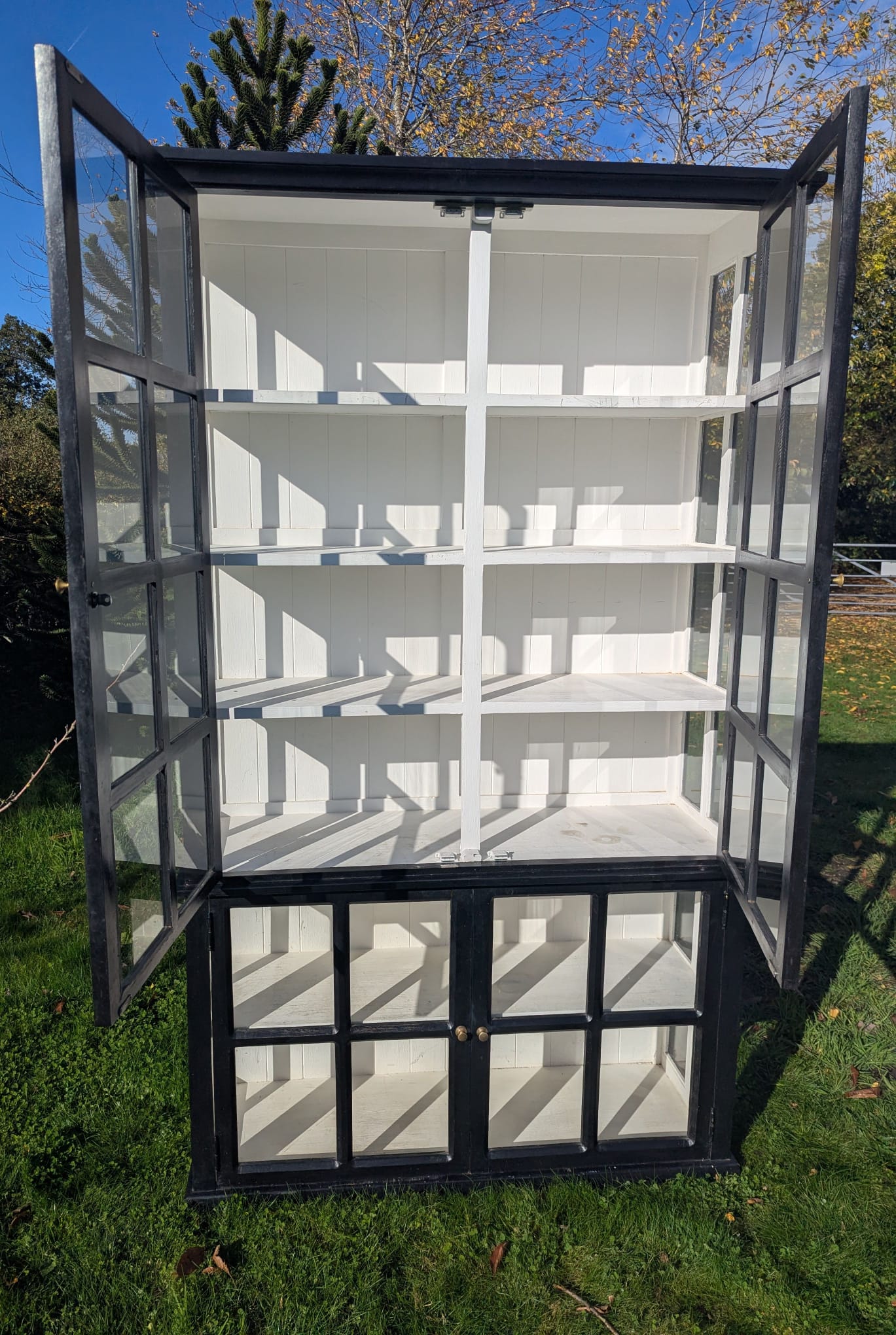 This Mid century French black glazed display cabinet, dating from the 1970s, exudes a stylish industrial charm. Handmade from wood and teak, with a brushed handle finish and painted black colour, it features four doors and six shelves, as well as original craftsmanship.