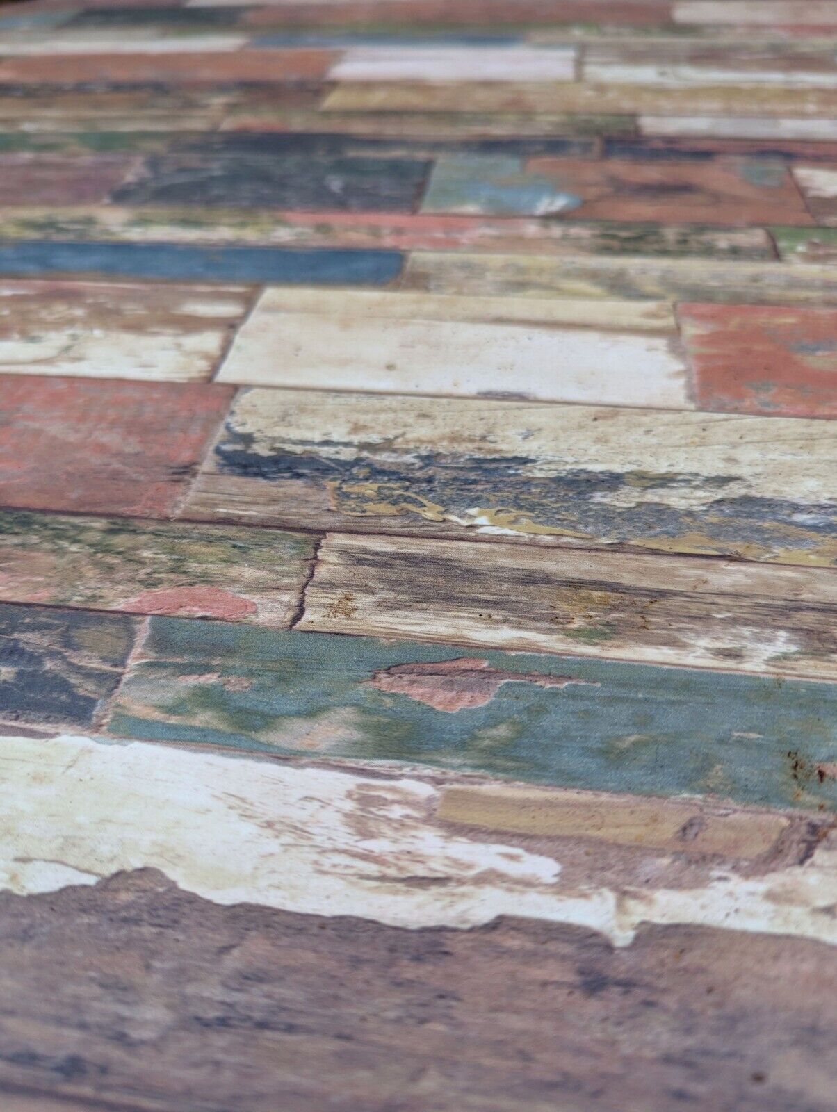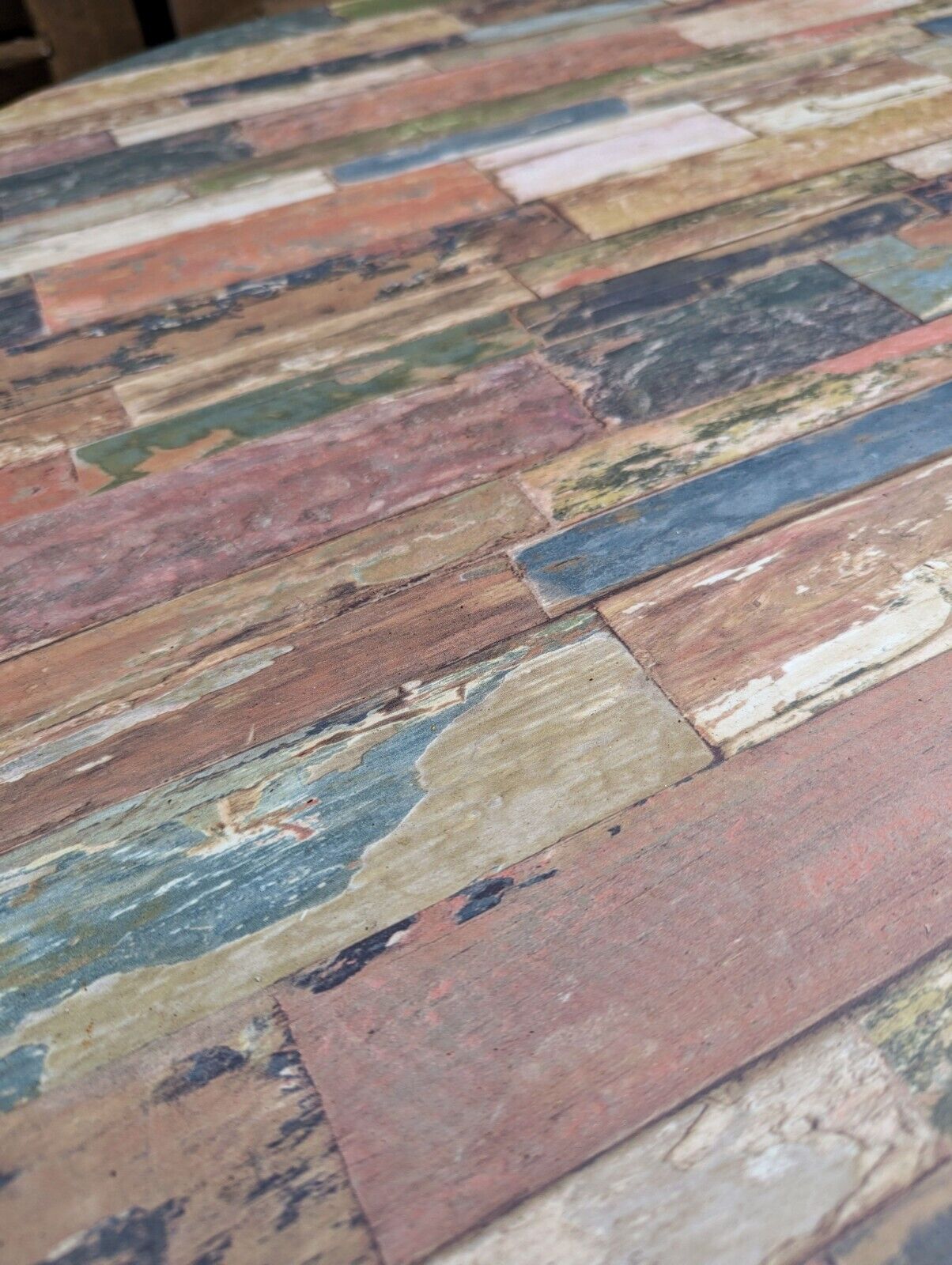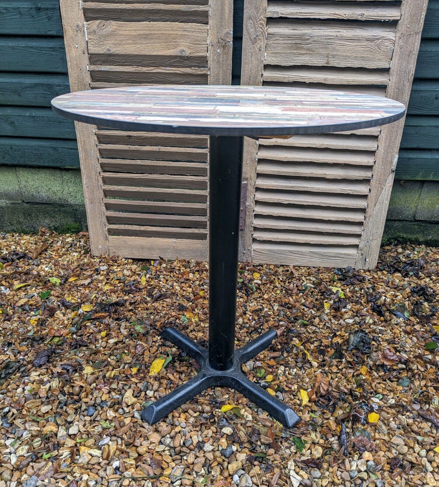 MODERN VINYL RUSTIC STYLE TOP, CAST IRON BASE BISTRO TABLE. GOOD SOLID HEAVY ITEM.