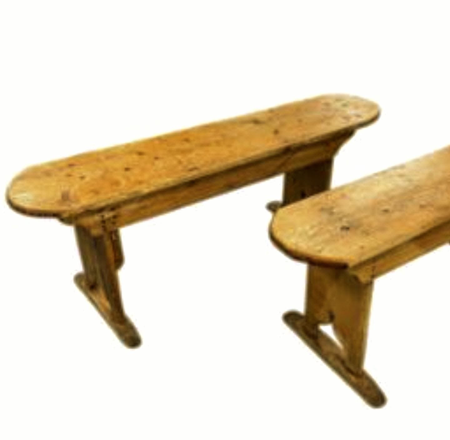 These freestanding benches weigh 10 kg each and are delivered with a production style of Vaseline. The vintage pine benches provide a touch of history and character to any dining , porch or hall etc area .