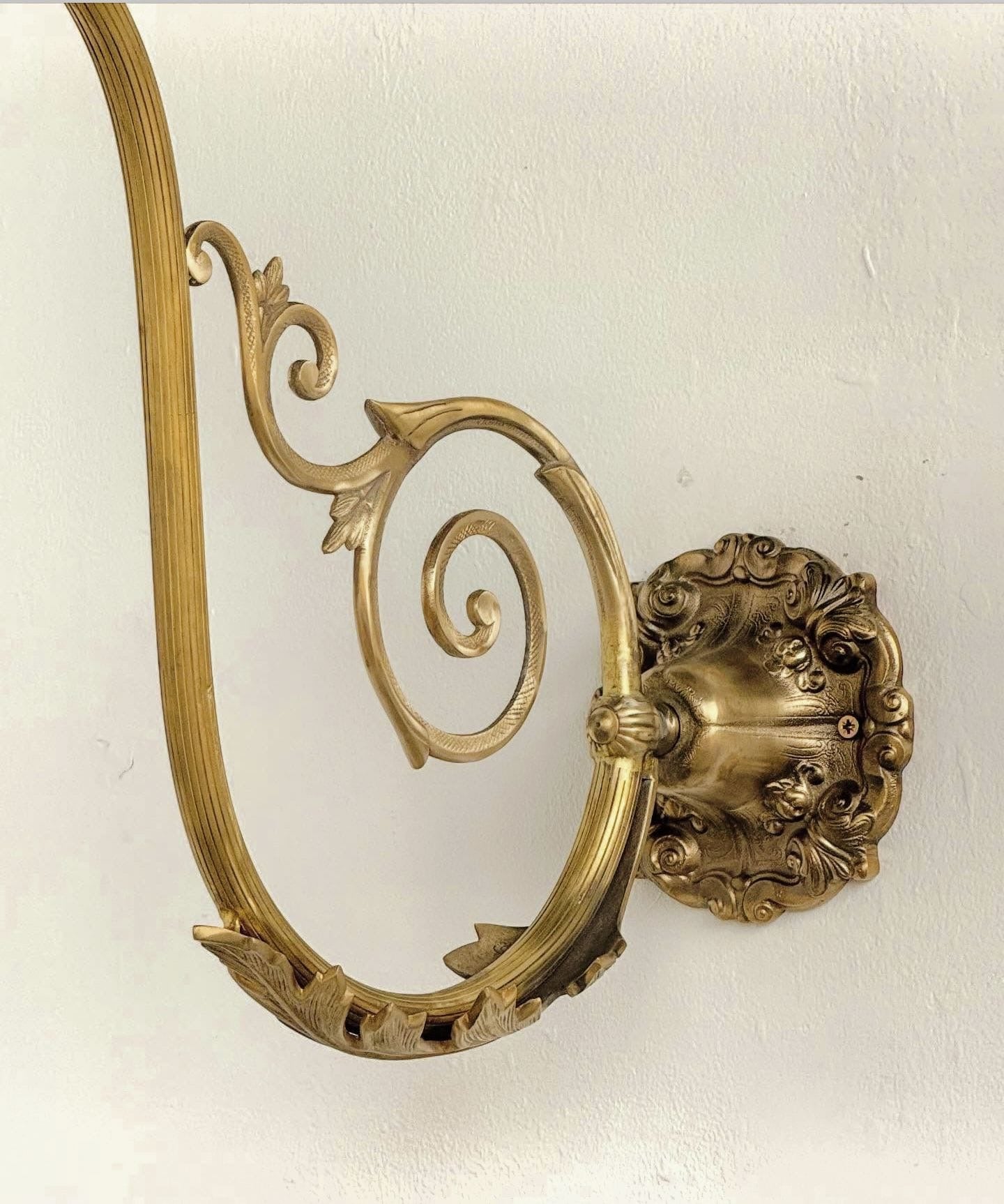 This product is a pair of vintage solid brass light brackets, perfect for adding an antique touch to any room. The medium-sized sconce style lights are made from vintage original materials, with a classic gold colour and a traditional design.