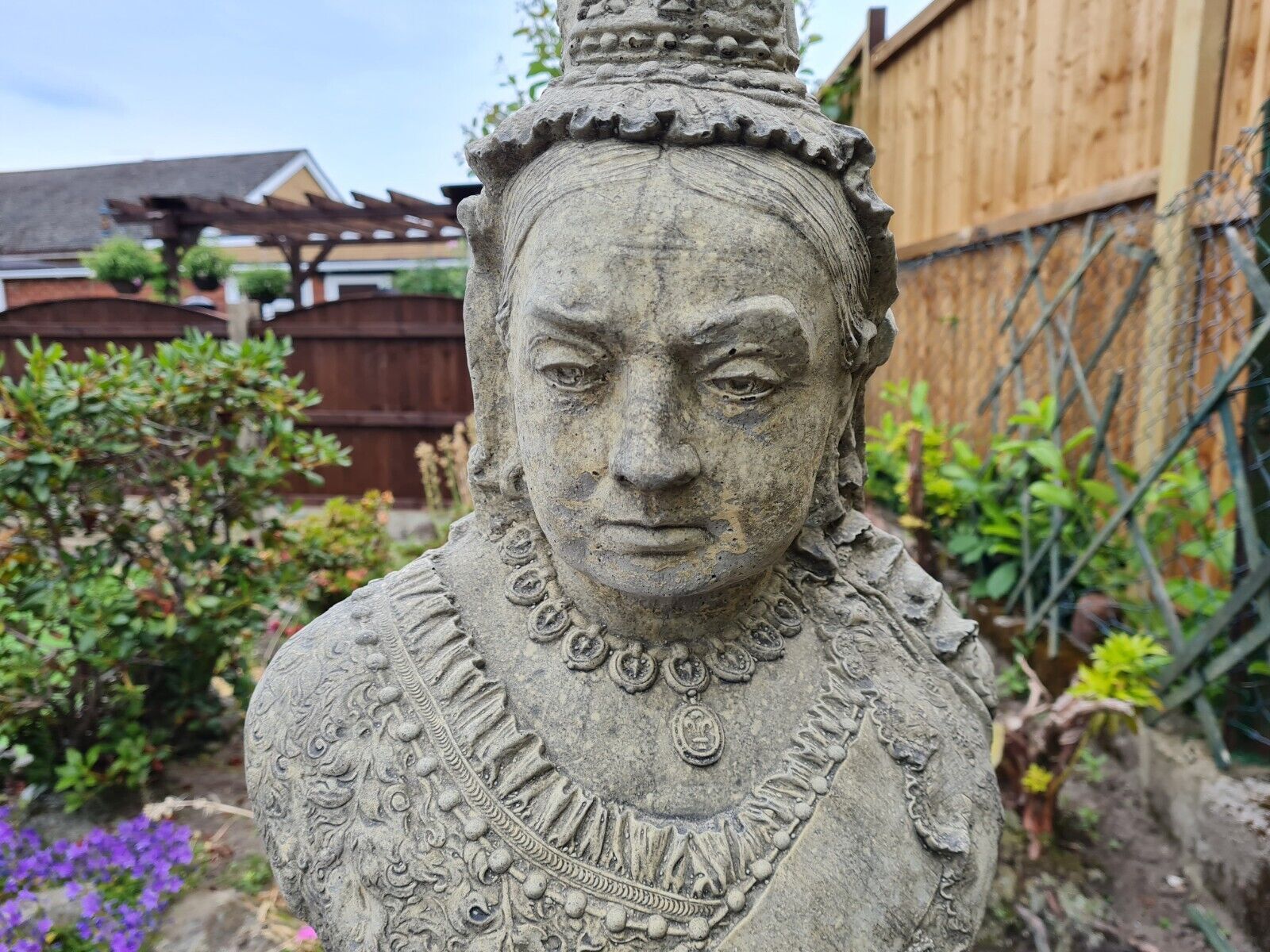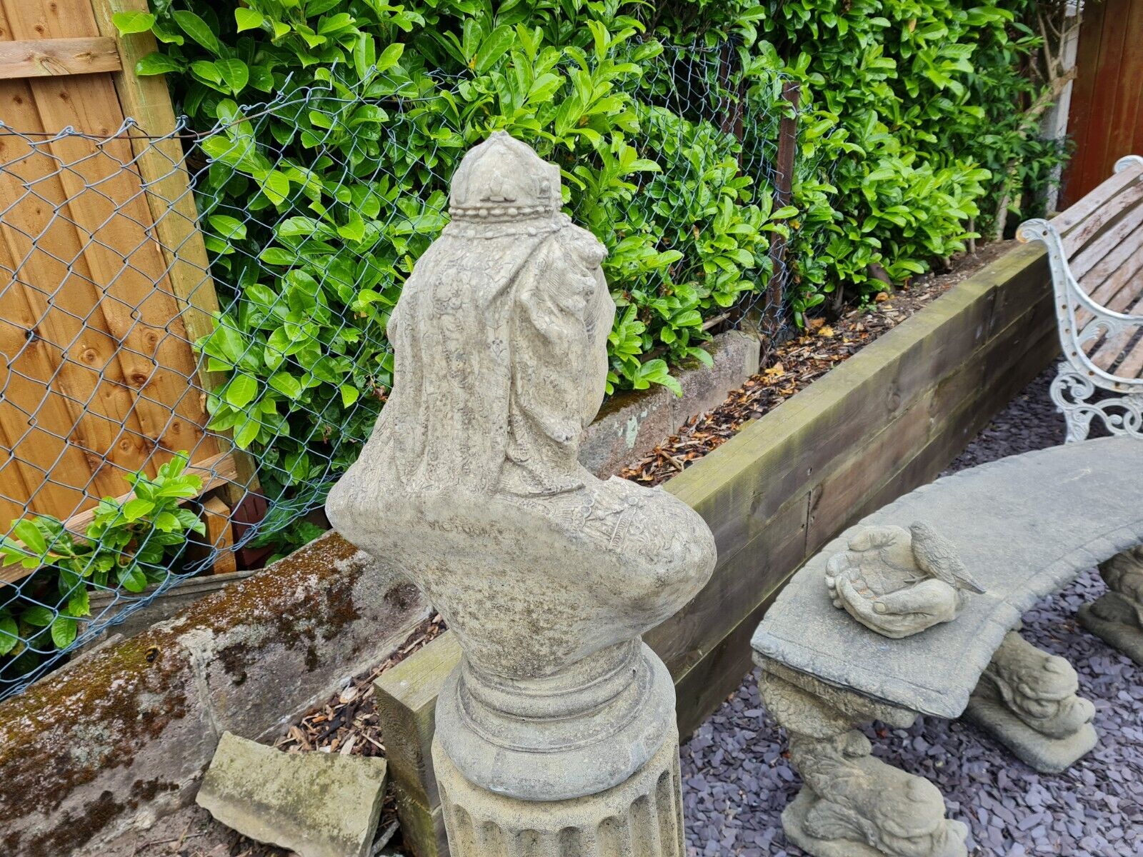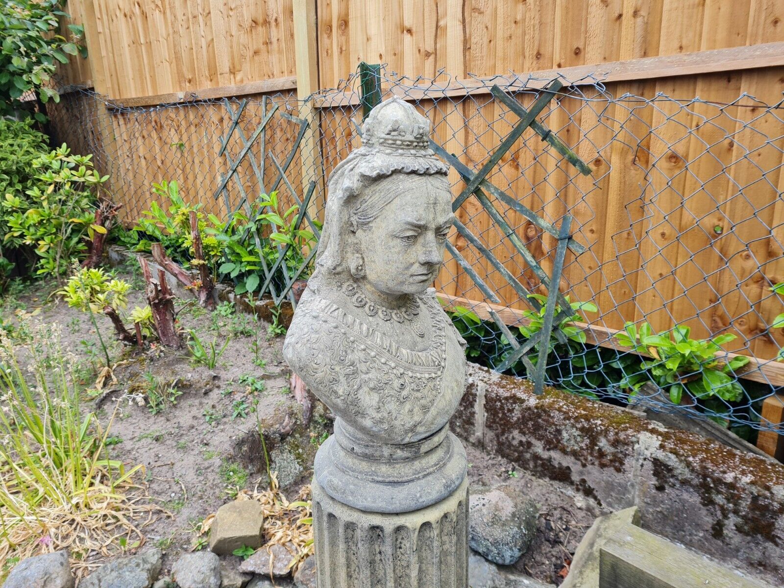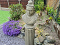QUEEN VICTORIA GARDEN ORNAMENT ENGLISH STONE. PLINTH BASE AVAILABLE. Bring a piece of history into your garden. This English stone ornament, crafted in the image of Queen Victoria, will be a stunning addition to your outdoor space!