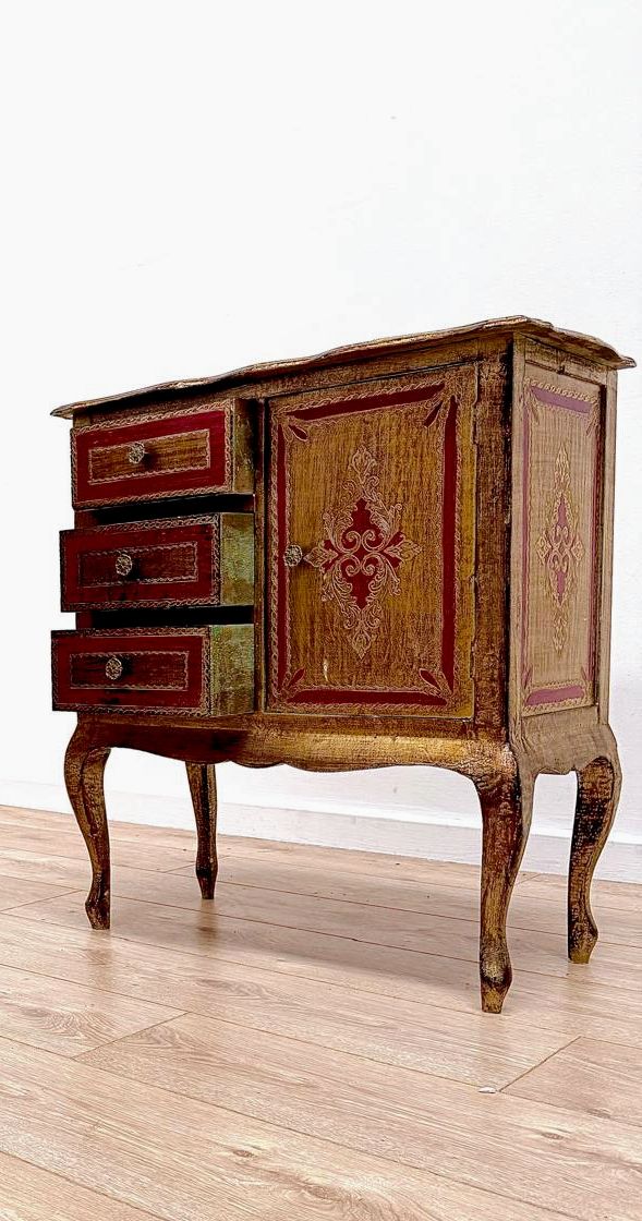 Discover the timeless elegance of these exceptional Italian Florentine cabinets - a matching pair from the early 20th century that commands attention in any room. Each unit features three generous drawers on one side and a spacious cupboard on the other, with shelved interiors perfect for displaying fine china, glassware, books, or cherished collections. Crafted with superior quality and authentic period character, these rare pieces blend sophisticated style with practical storage, transforming your living space into a showcase of refined taste. Delivery available.