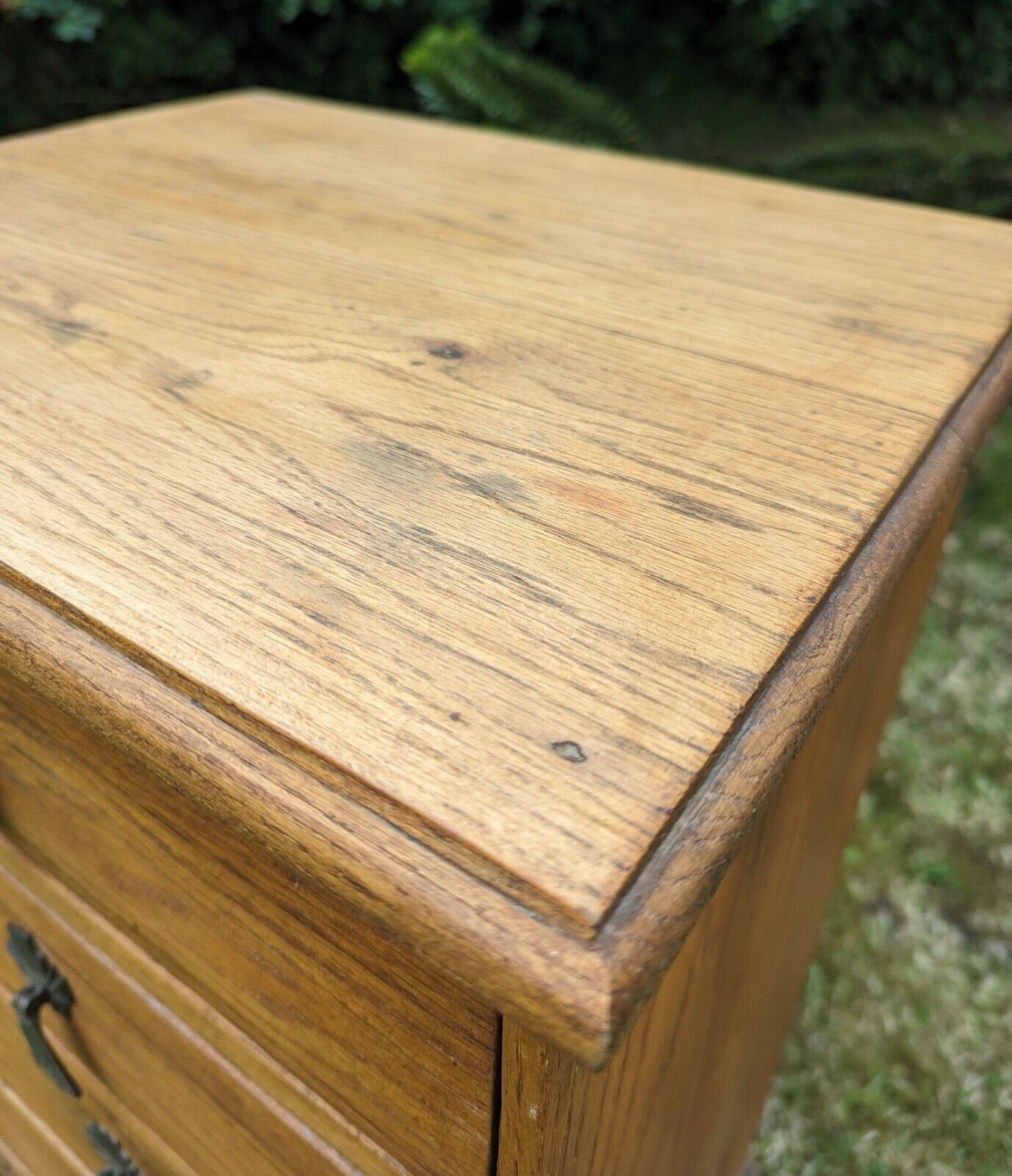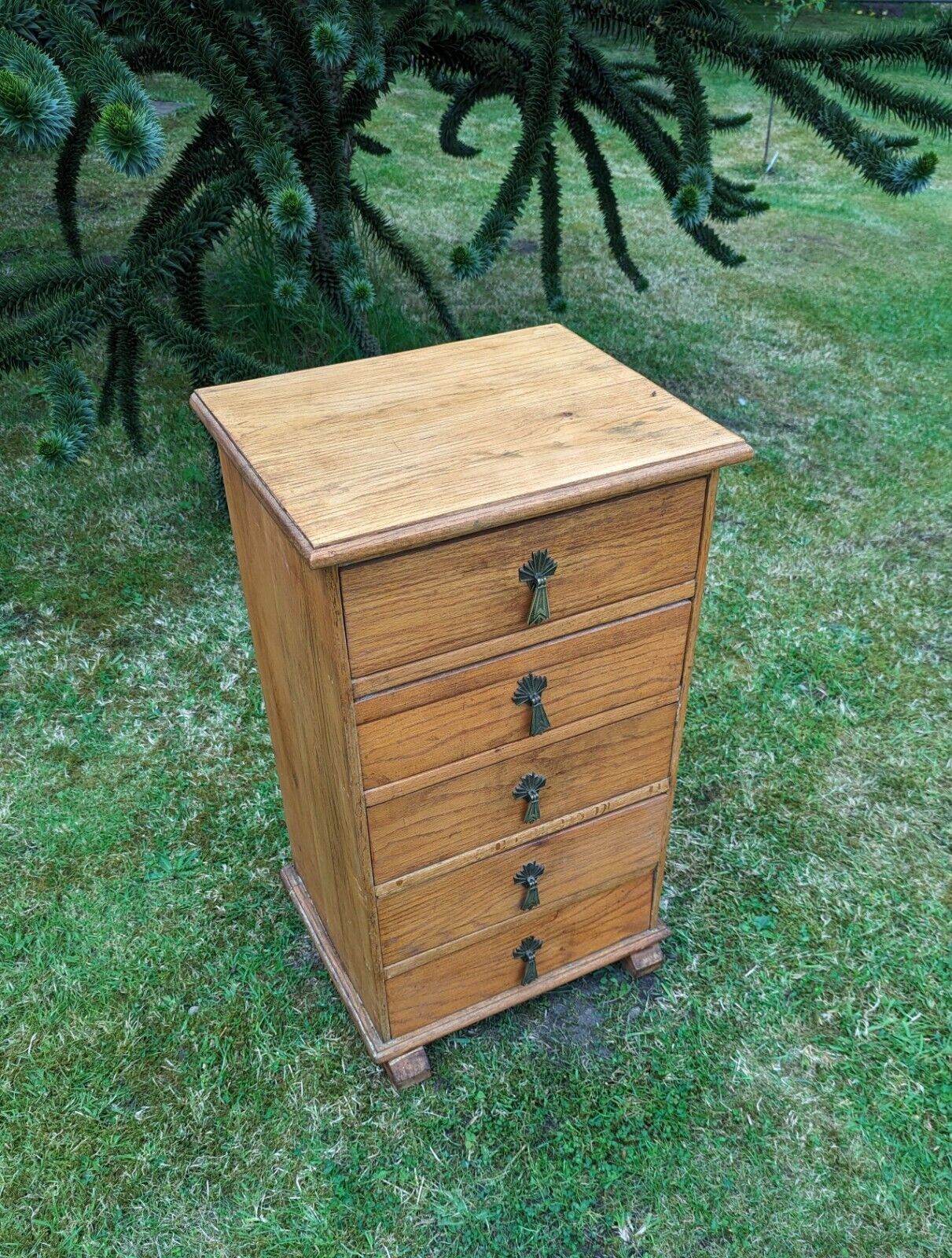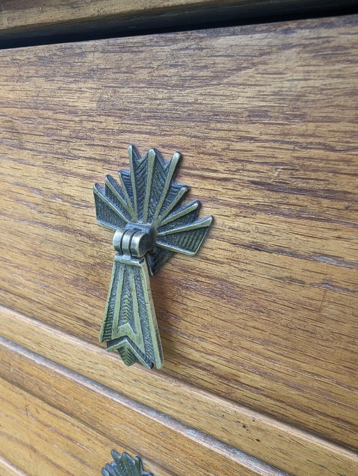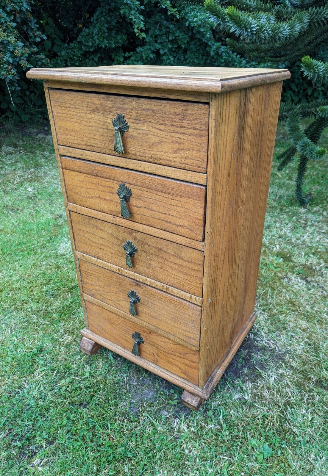 This superb quality 1930s Art Deco chest of drawers is a stunning addition to any home. Crafted from solid oak, it features a beautiful brown colour and brass handles. With a maximum weight capacity of 10kg and measuring 45cm in length, 37cm in width, and 80cm in height, this chest of drawers is perfect for storing your clothes and other items.