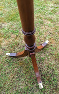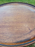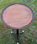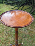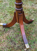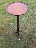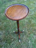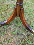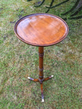 This vintage mahogany jardiniere stand features a tripod pedestal support, brass casters, and a circular top. All restoration is done to preserve its authenticity, and as expected, it features signs of wear and tear that add to its character and charm.