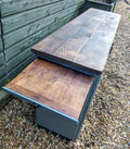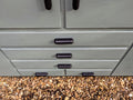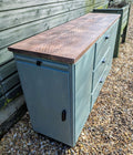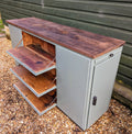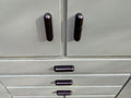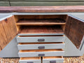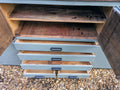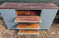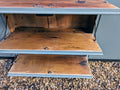 2 end cabinets with 2 pull out desk work surfaces and 3 drop down shelves/work surfaces. Distressed paint finish.
