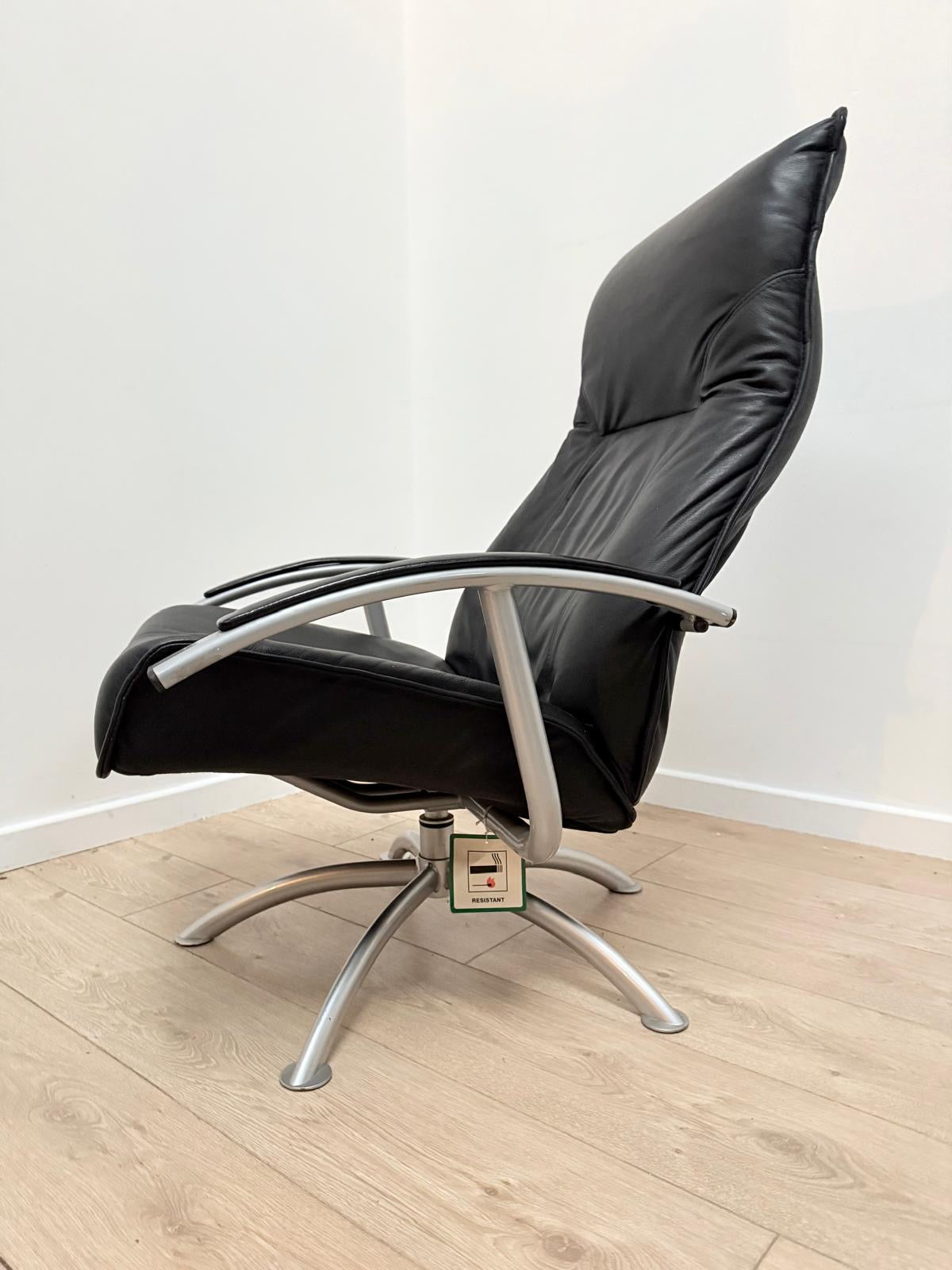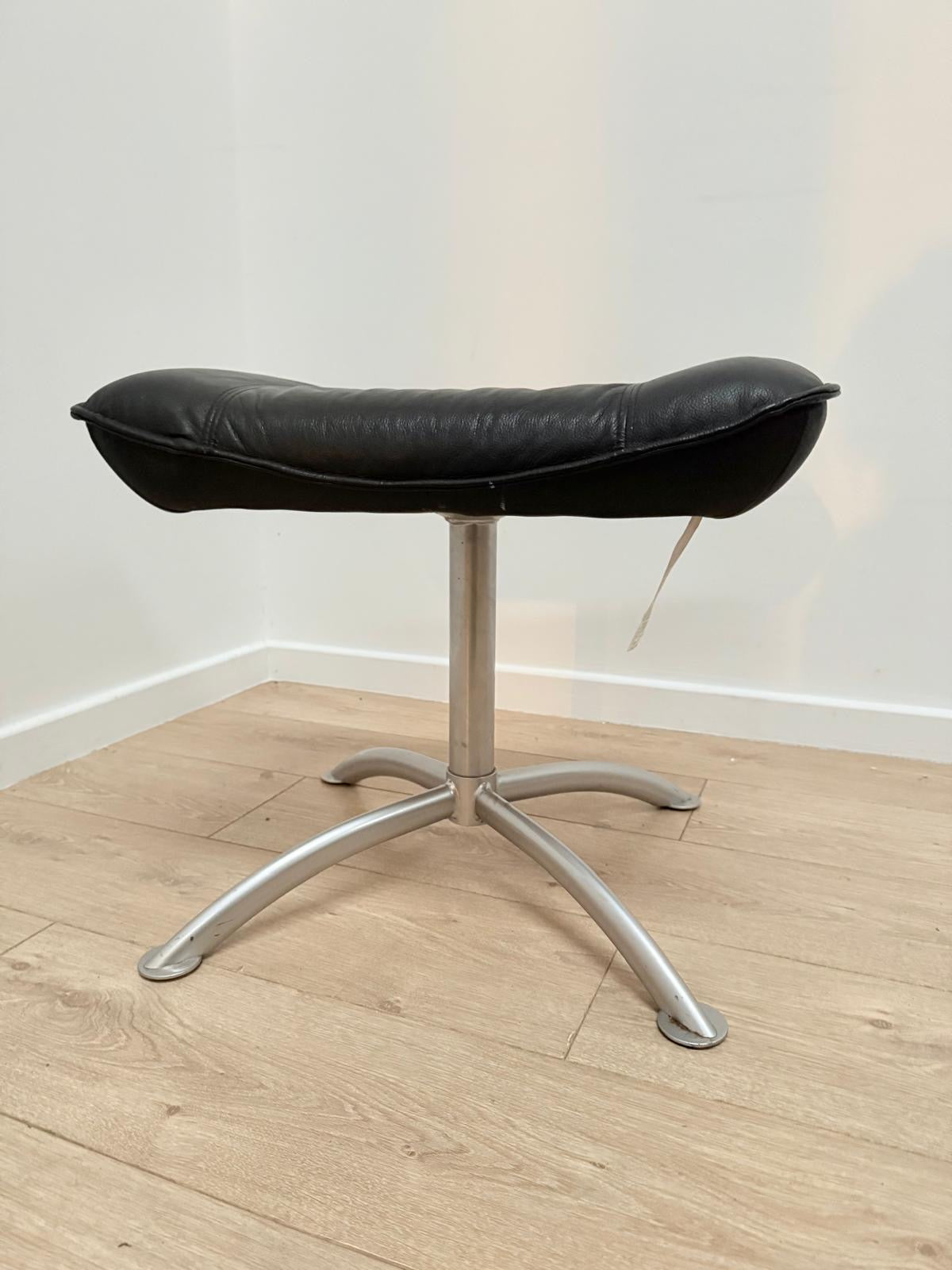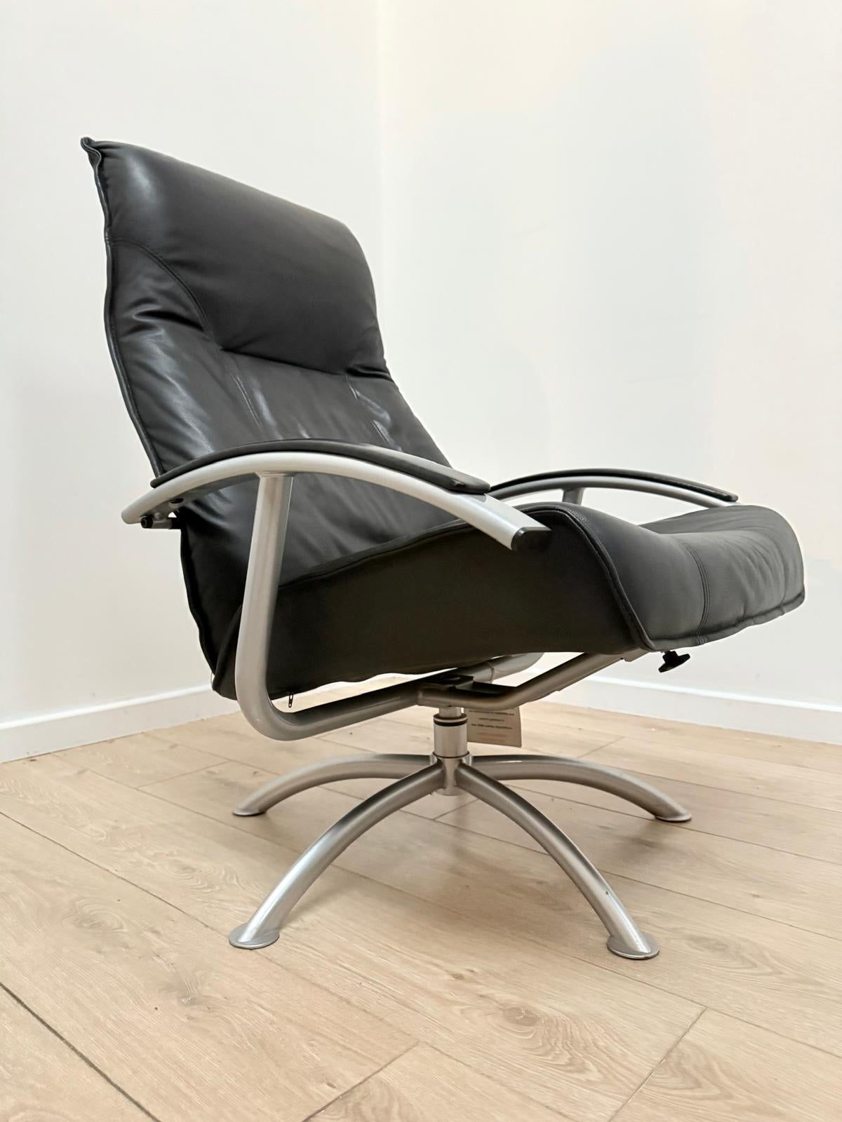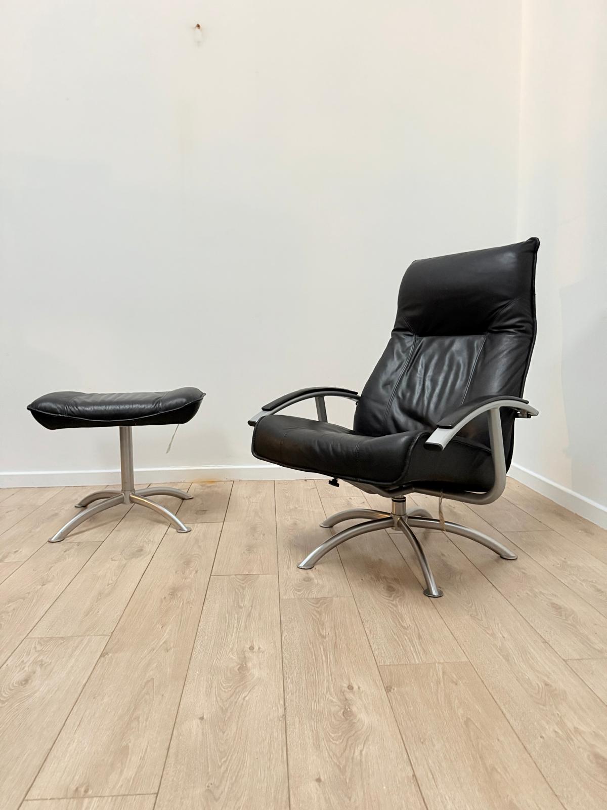 This superb vintage Danish Kebe black leather swivel recliner with ottoman footstool is a must-have for any collector or lover of retro furniture.