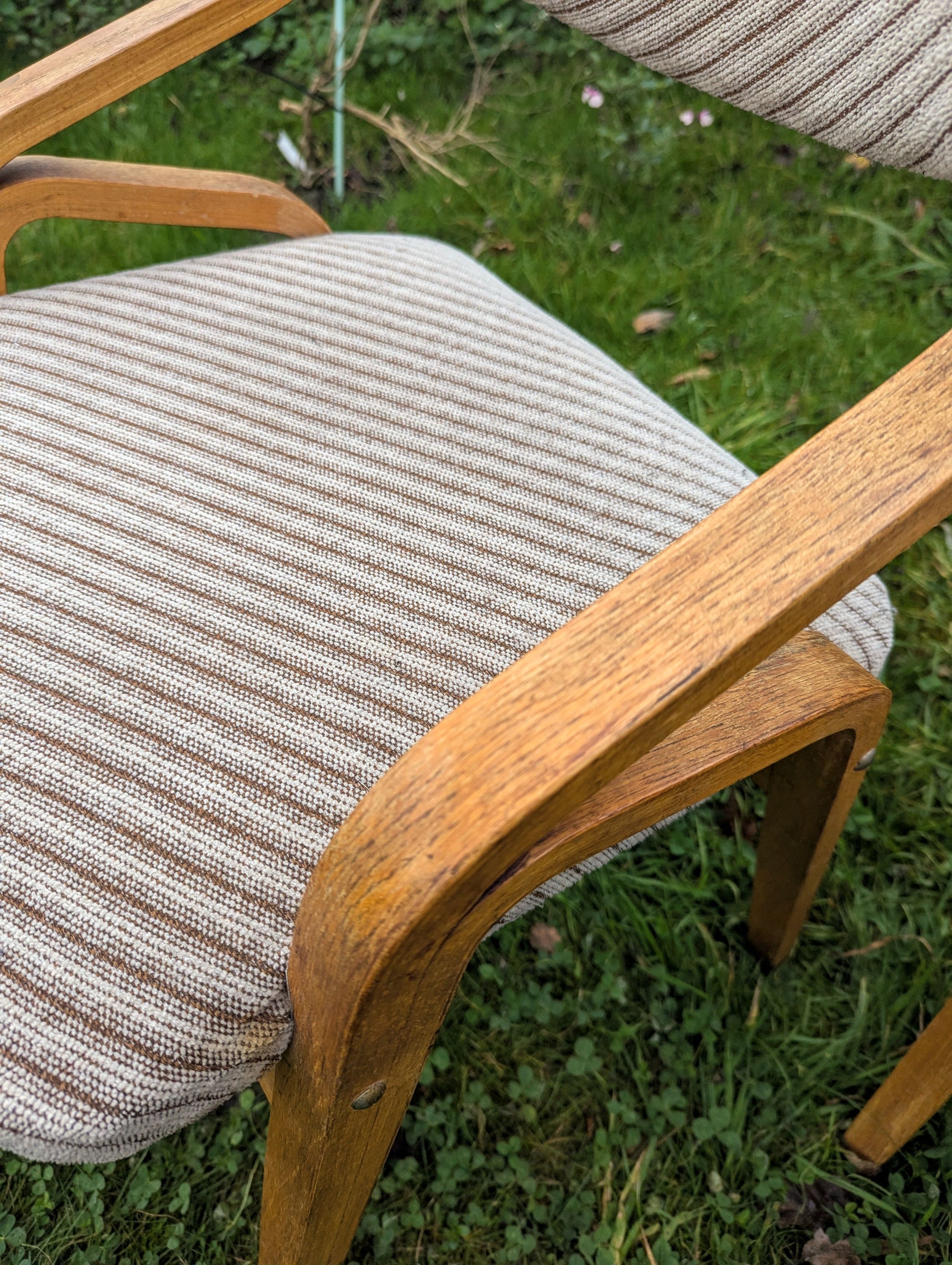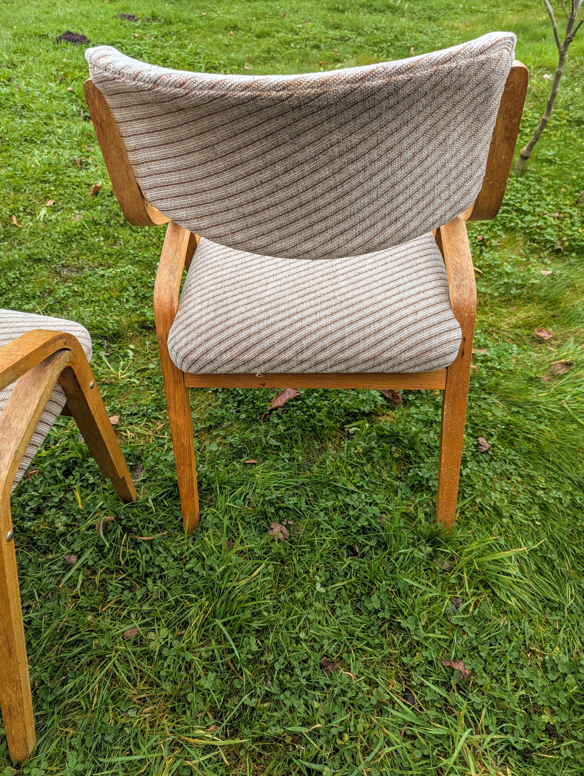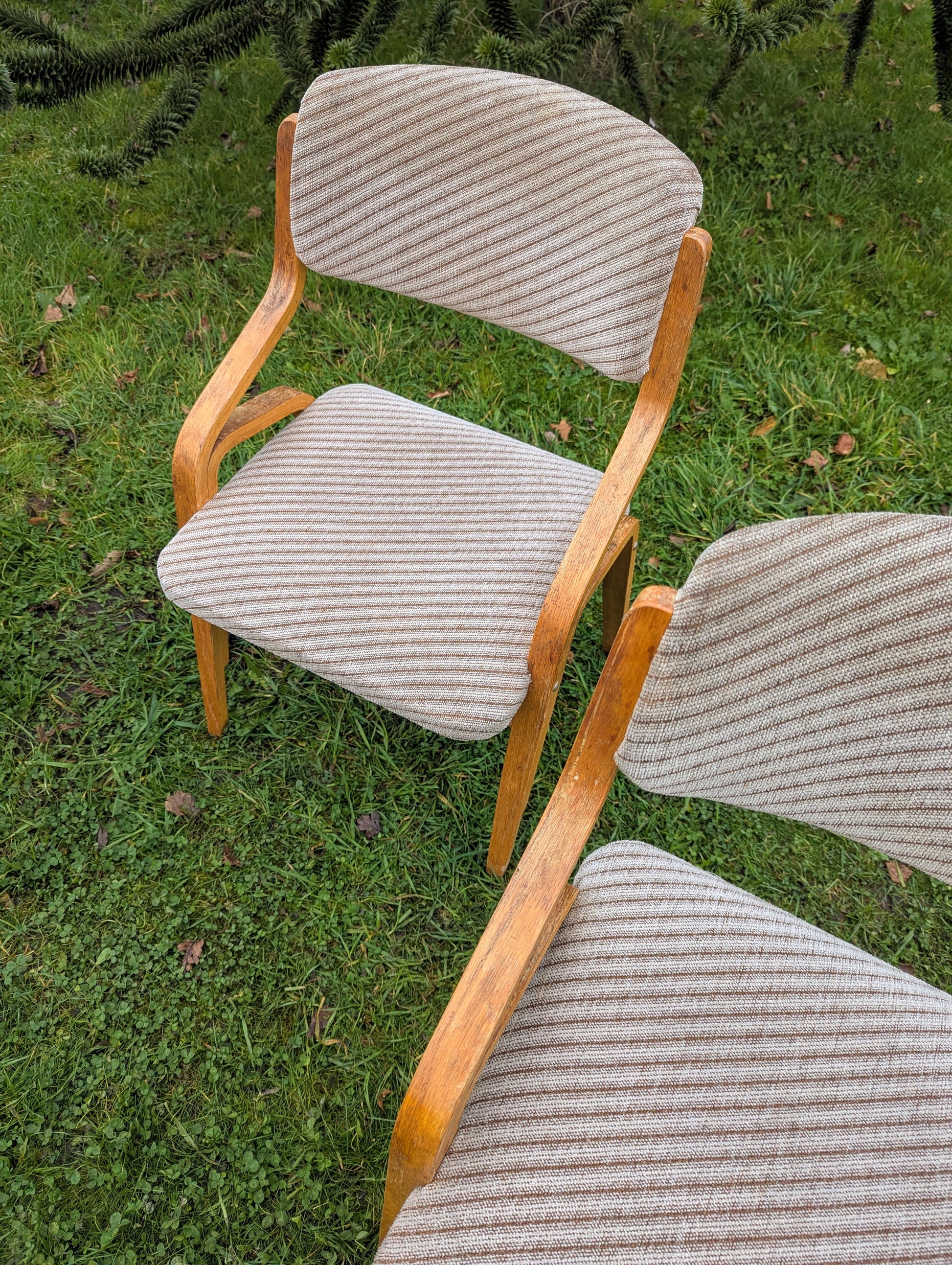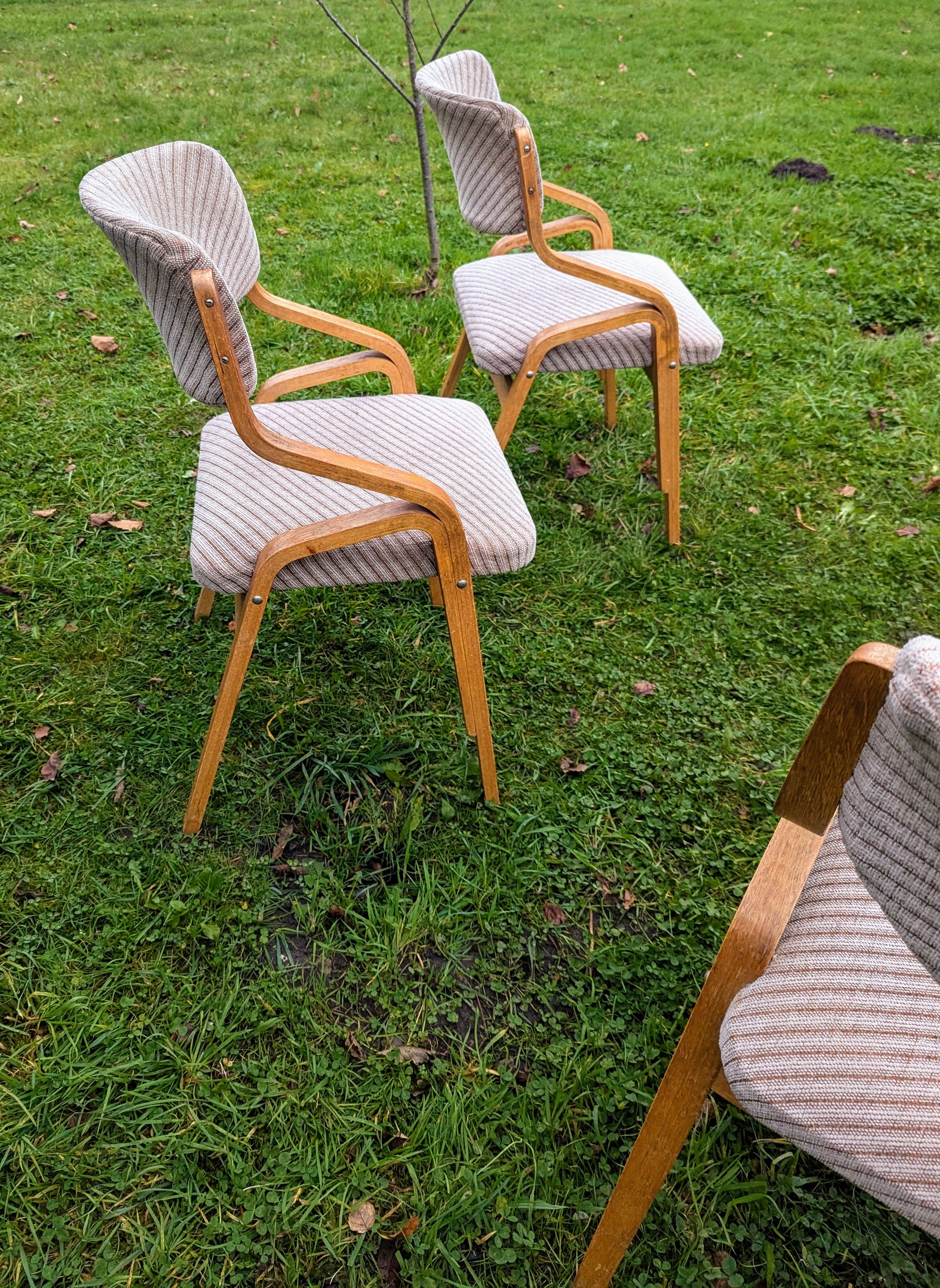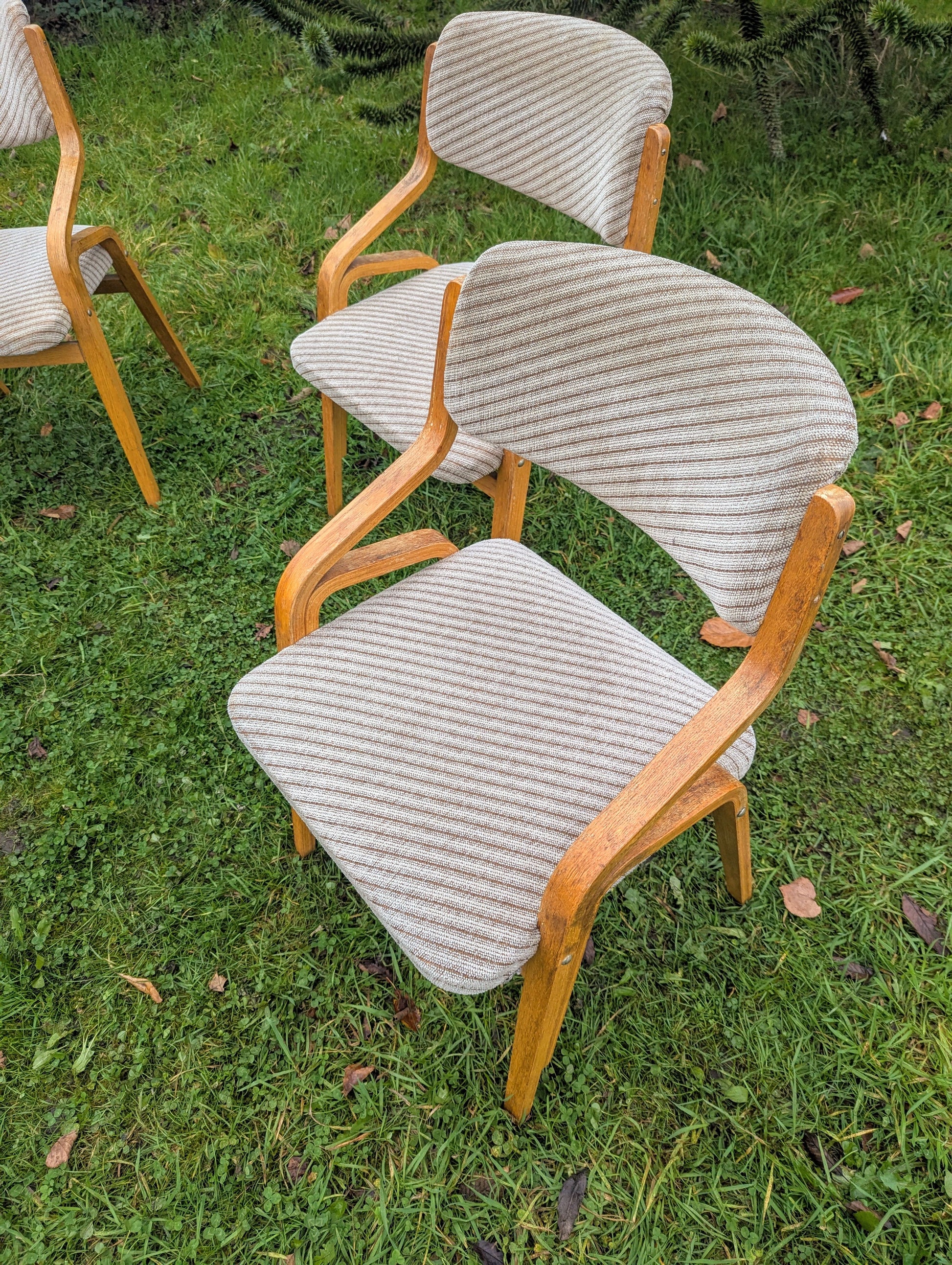 Four stunning bentwood chairs, featuring a unique mid-20th century design by Radomír Hofman. These chairs are a true collectable item, perfect for any vintage or retro enthusiast. Crafted with exceptional attention to detail, they are a testament to the incredible skill of the artisans who made them. The chairs are in a wonderful state of repair and have been beautifully striped upholstered for maximum comfort. They are perfect for adding a touch of vintage charm to any room and are sure to be a conversation starter. Don't miss the opportunity to own these exquisite chairs, the like of which are no longer made. Labelled. Height = 80 cm Width = 49.5 cm Depth = 54 cm Seat height = 44 cm All restoration is done sympathetically to their former glory. With all furniture of this age it's consistent showing signs of wear and tear, these add to its charm and character . You may find these under our cleaner this is absolutely what you should expect when buying genuine vintage items. |
