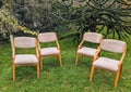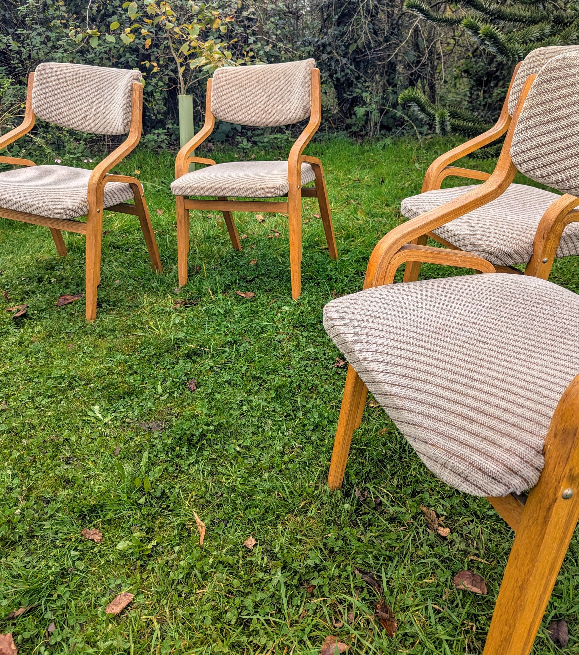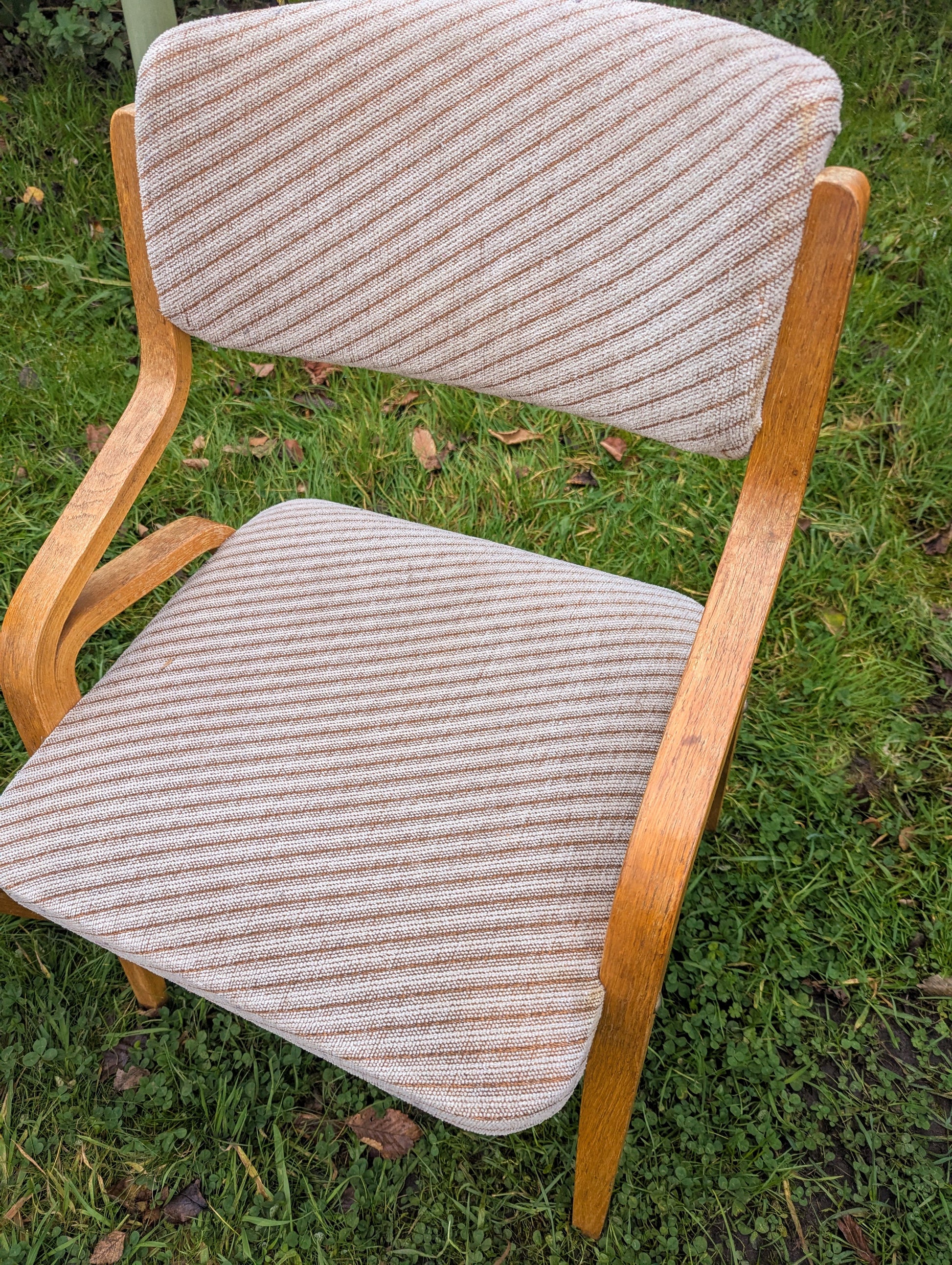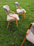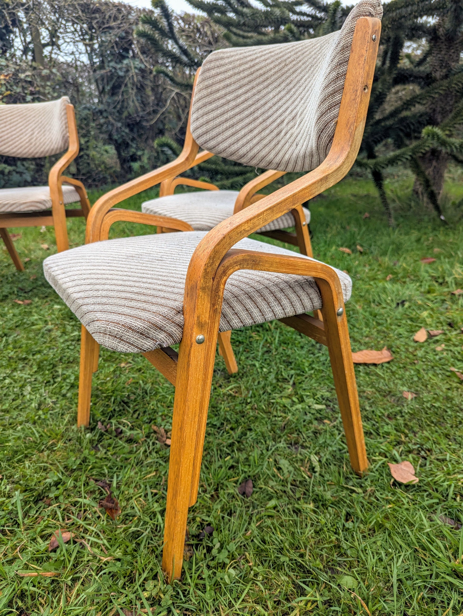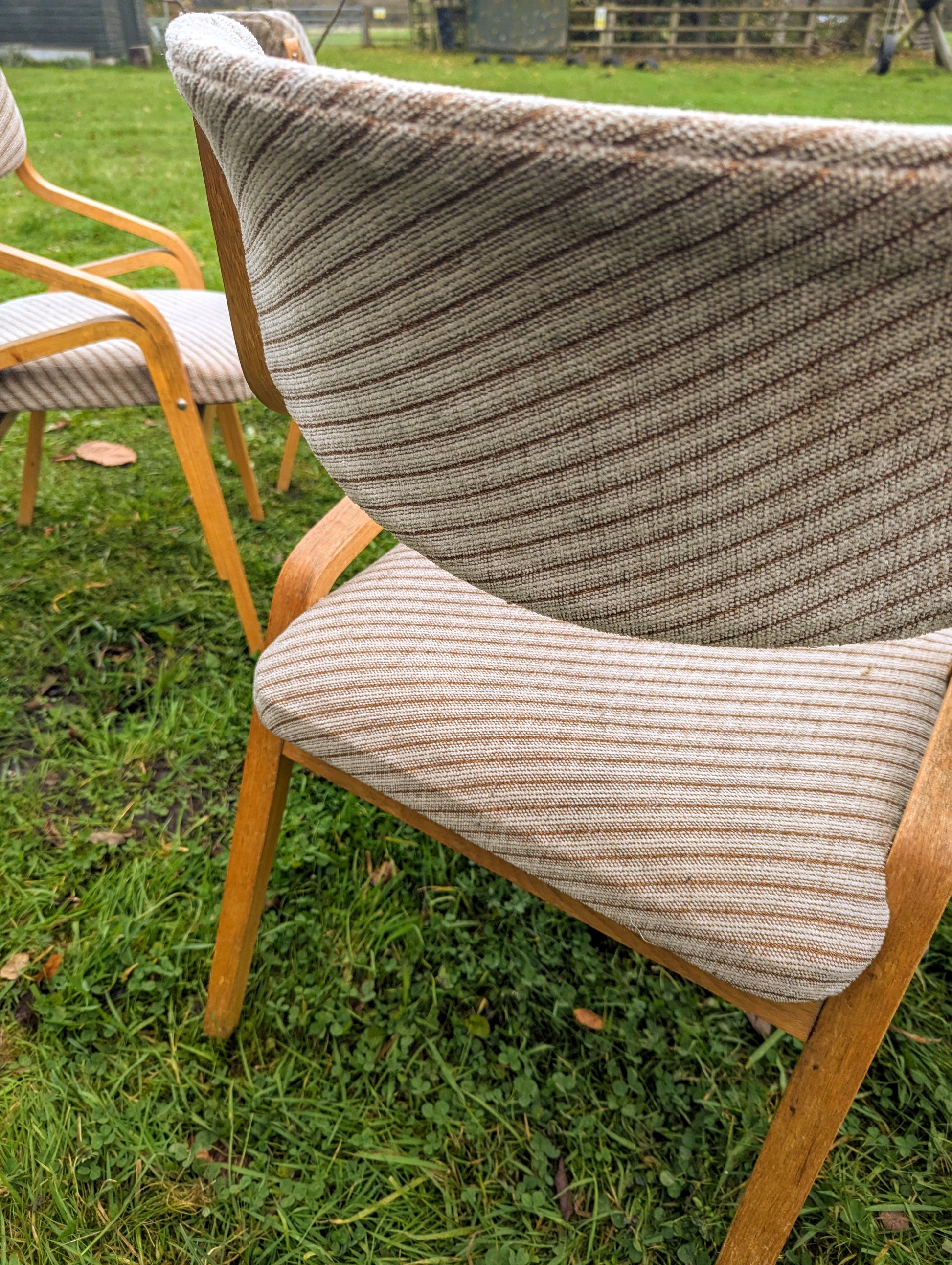 Four stunning bentwood chairs, featuring a unique mid-20th century design by Radomír Hofman. These chairs are a true collectable item, perfect for any vintage or retro enthusiast. Crafted with exceptional attention to detail, they are a testament to the incredible skill of the artisans who made them. The chairs are in a wonderful state of repair and have been beautifully striped upholstered for maximum comfort. They are perfect for adding a touch of vintage charm to any room and are sure to be a conversation starter. Don't miss the opportunity to own these exquisite chairs, the like of which are no longer made. Labelled. Height = 80 cm Width = 49.5 cm Depth = 54 cm Seat height = 44 cm All restoration is done sympathetically to their former glory. With all furniture of this age it's consistent showing signs of wear and tear, these add to its charm and character . You may find these under our cleaner this is absolutely what you should expect when buying genuine vintage items. |
