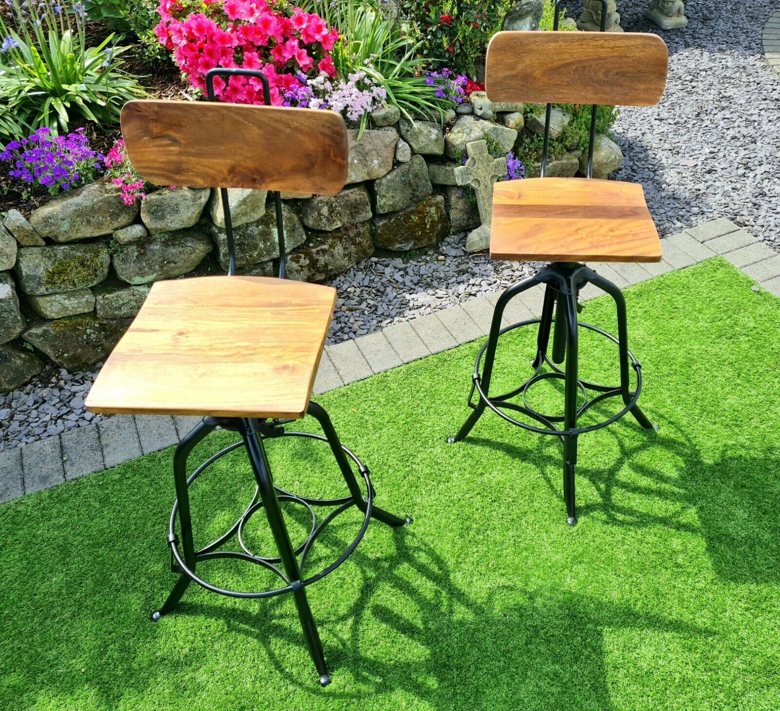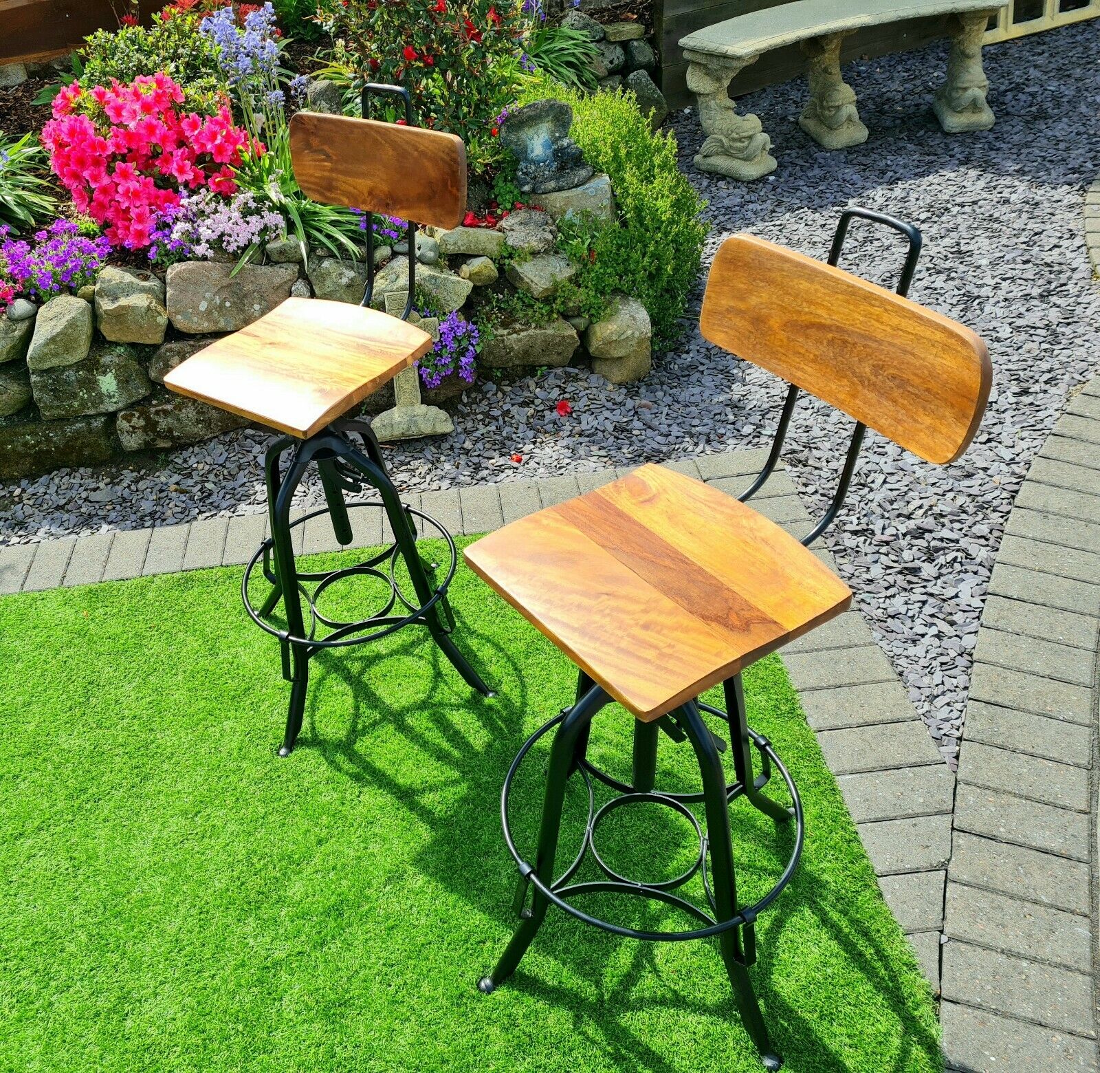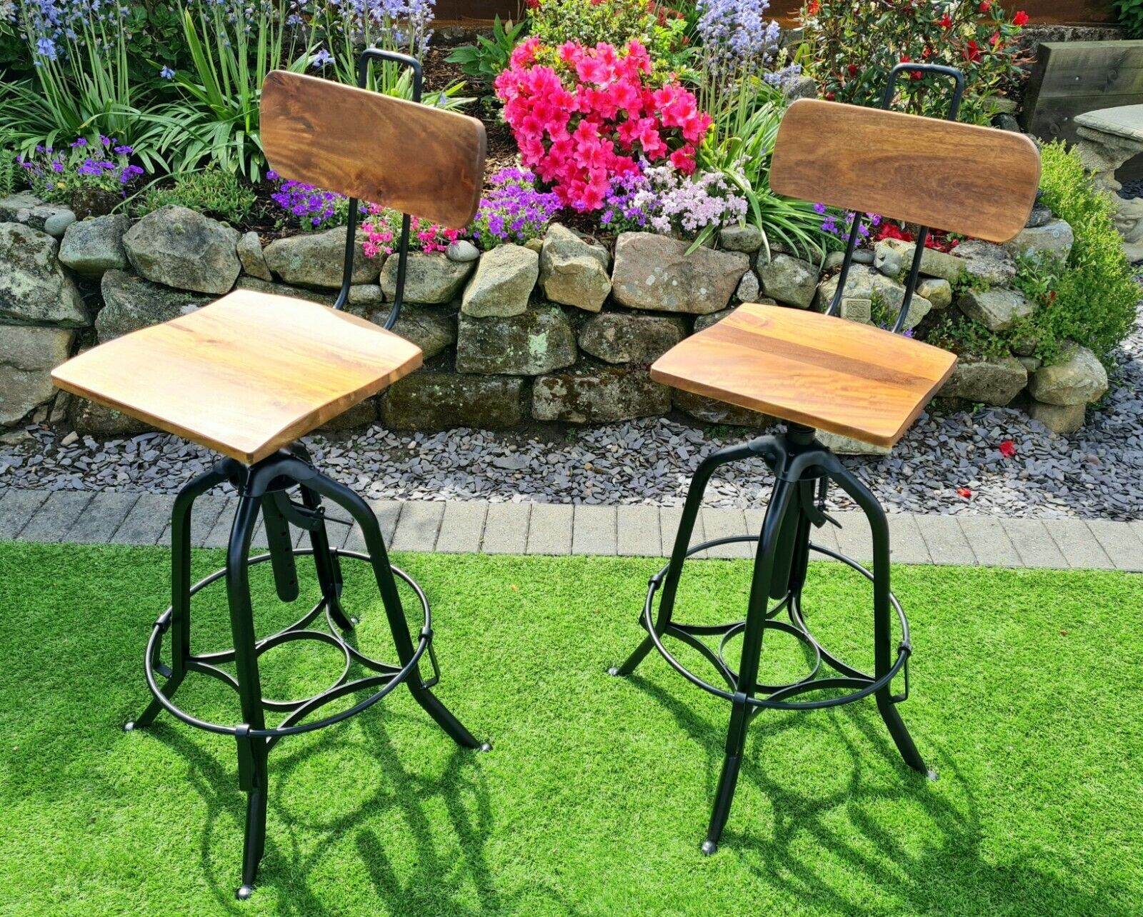 VINTAGE MANGO WOOD INDUSTRIAL BAR STOOL.
