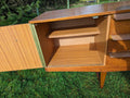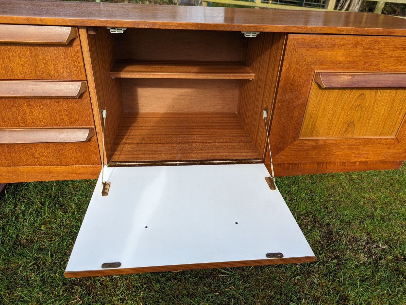This vintage mid-century sideboard by Stateroom is the perfect addition to any room. Made of teak wood with a brown sealed finish, it features three drawers the top one being a green velvet section drawer and two cupboards with shelves and a drop-down cocktail cupboard for ample storage space.