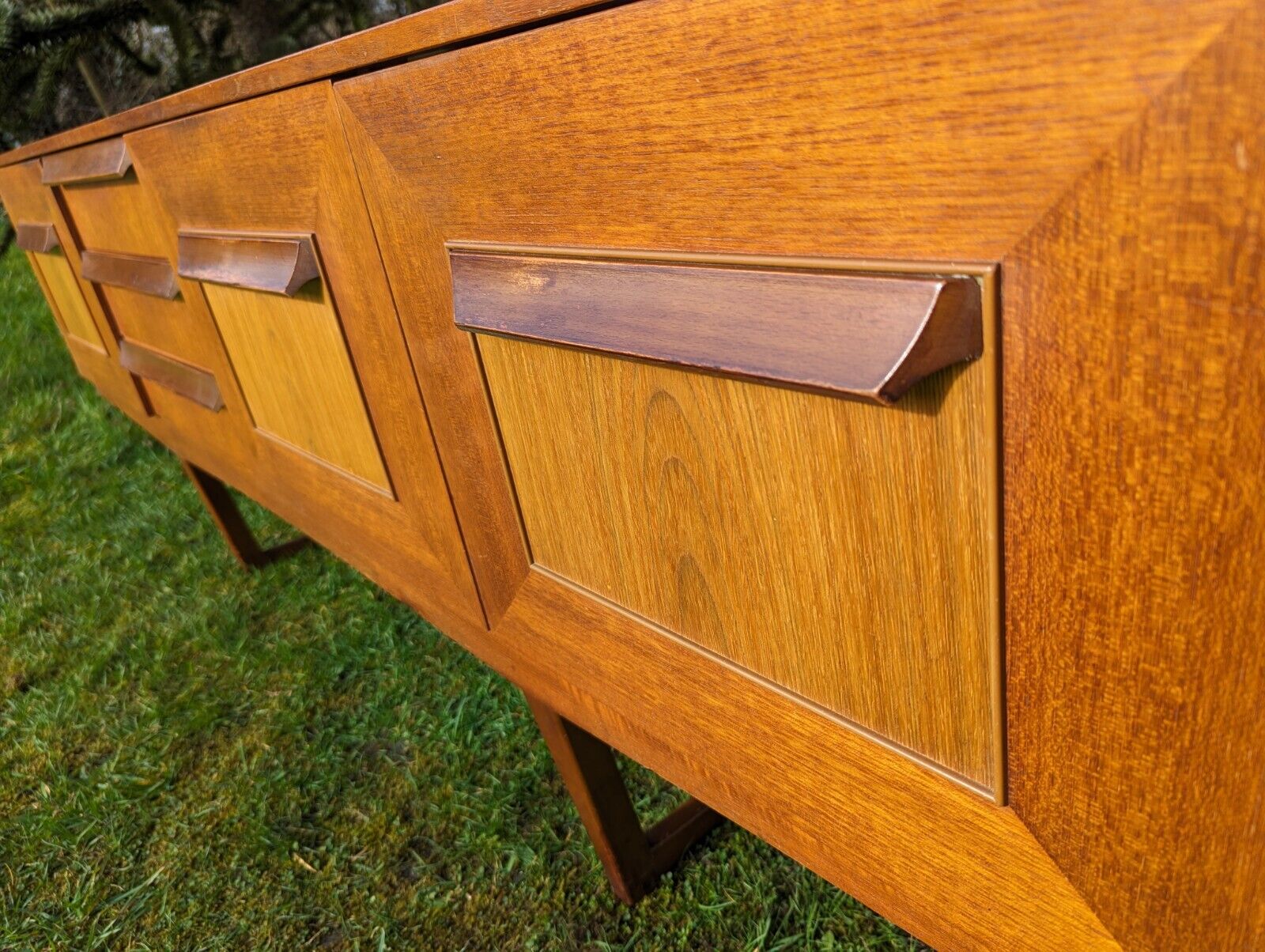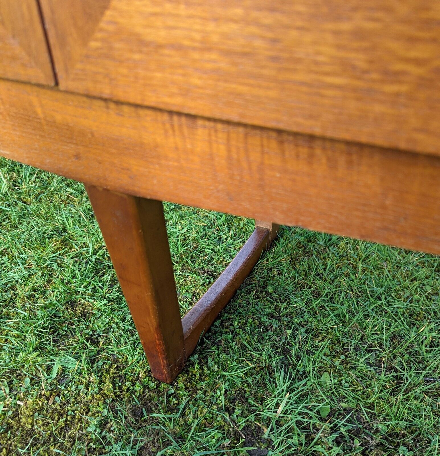 Measuring 198cm in length, 53cm in width and 72cm in height, this sideboard is suitable for use in the living room, sunroom, home office, lounge, den, or dining room. It was manufactured in 1950 and weighs more than 140lbs. Delivery is available for this item.