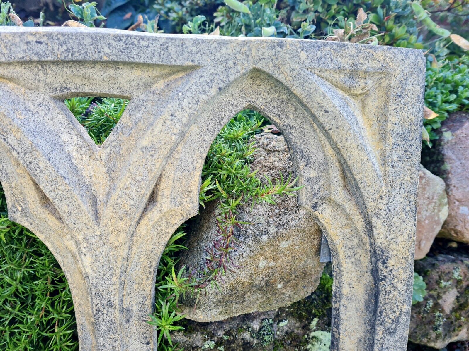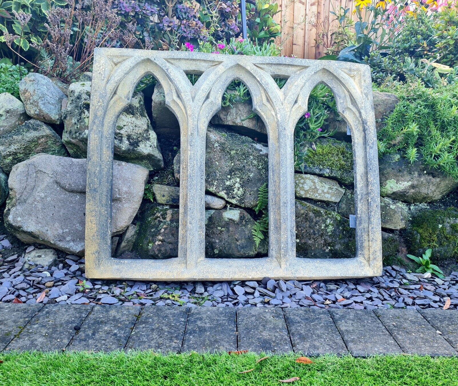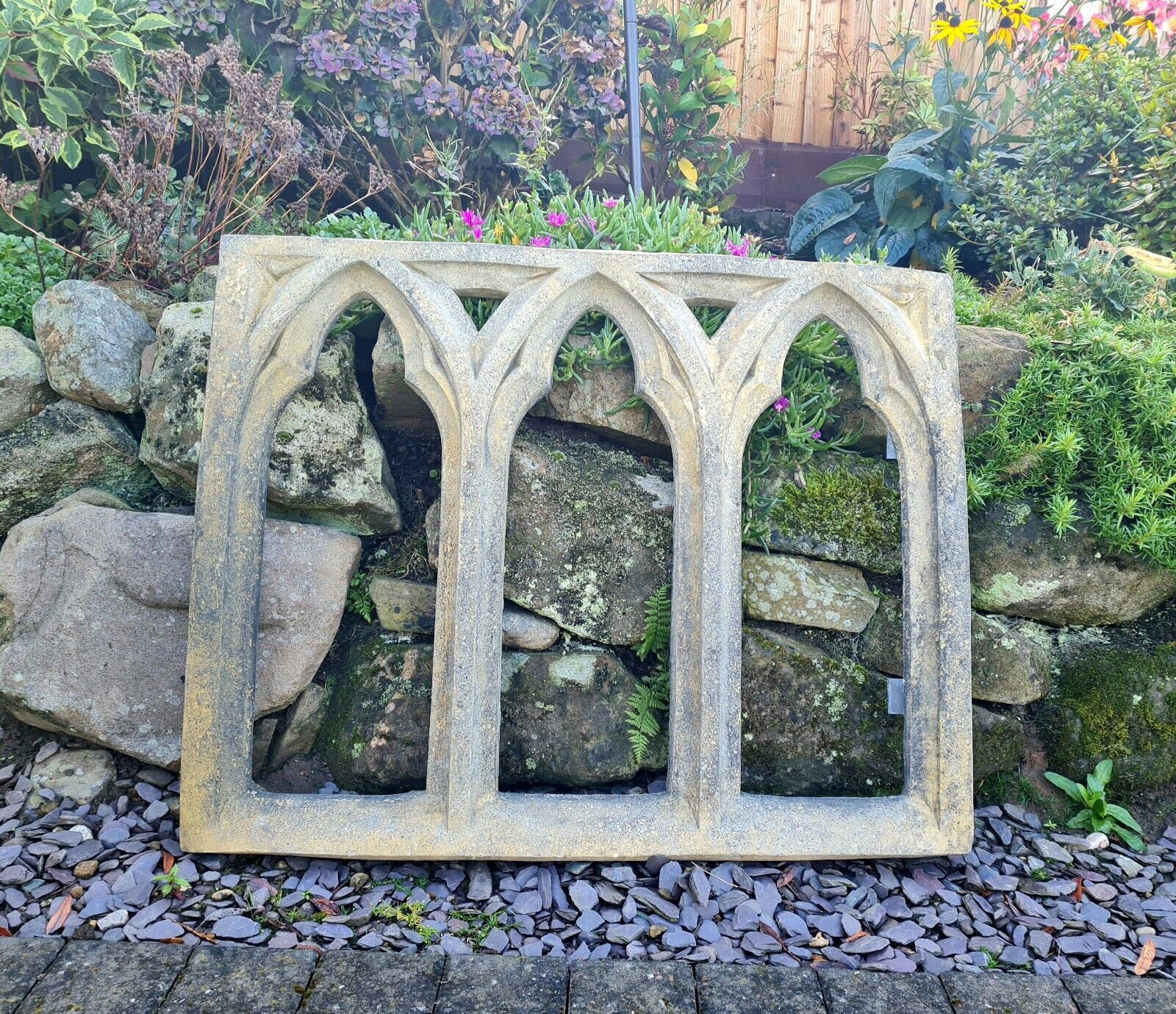 Yorkshire Church Style Triple Arch Window Vintage English Stone. Led flaps are attached to the rear to hold a mirror or cut glass.